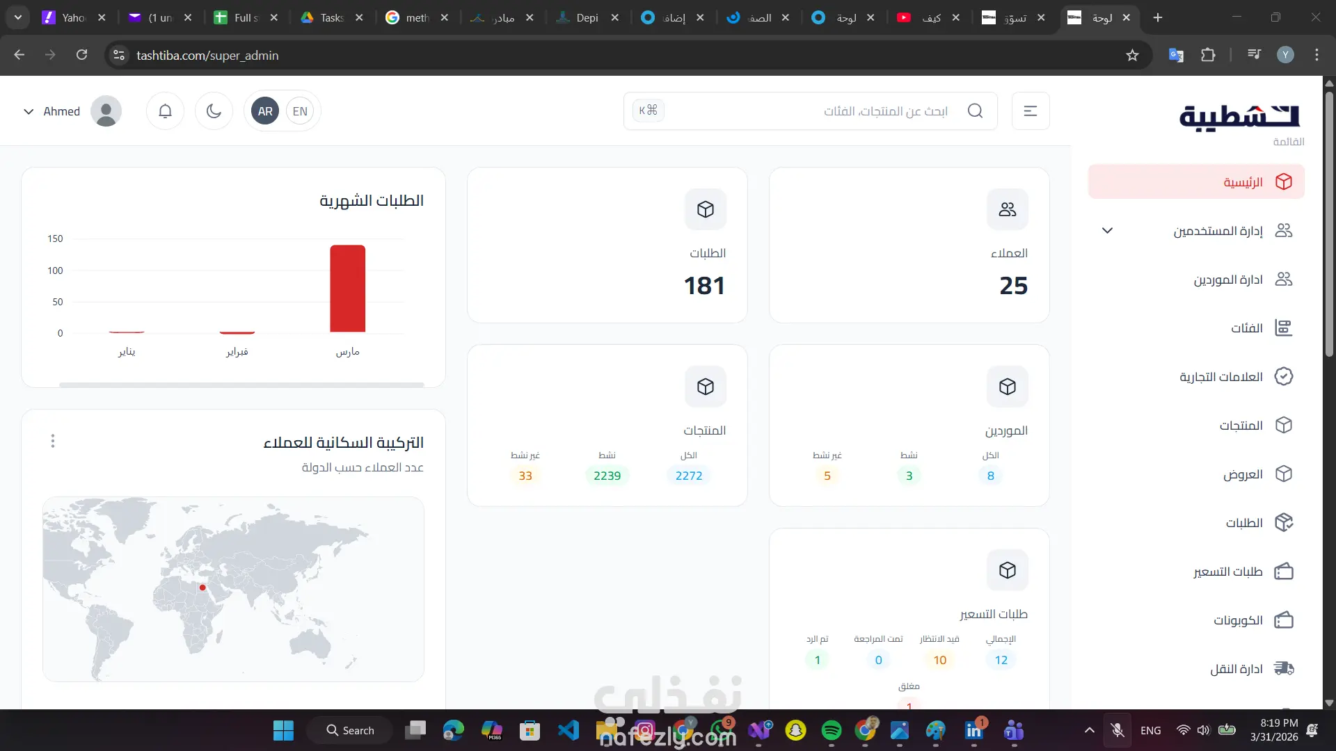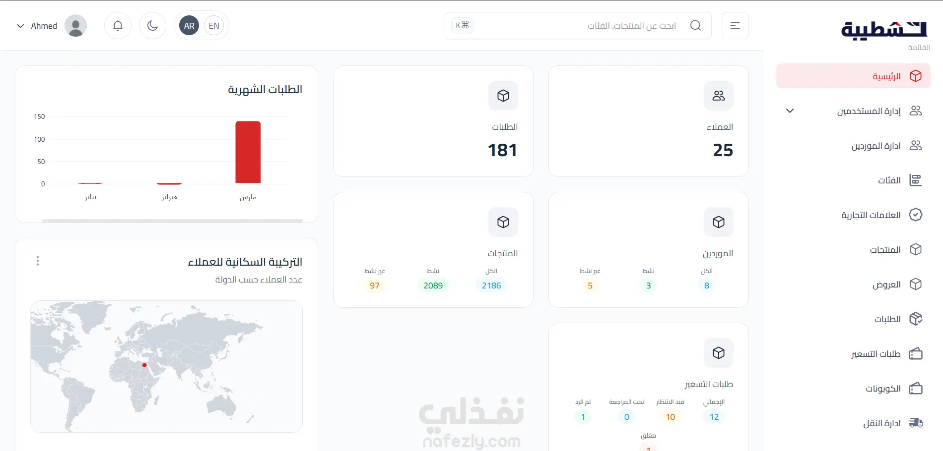 بناء هيكلية الواجهة الأمامية لنظام يدعم ثلاثة أدوار (مستخدم، تاجر، مدير نظام). تنفيذ نظام صلاحيات معقد (Role-based Routing) لتأمين لوحات التحكم. دعم كامل للغتين العربية والإنجليزية باستخدام i18next.إدارة البيانات وحالة السيرفر بكفاءة عالية باستخدام React Query لضمان سرعة الأداء. المهارات المستخدمة: React.js, TypeScript, Tailwind CSS, React Query, i18next.