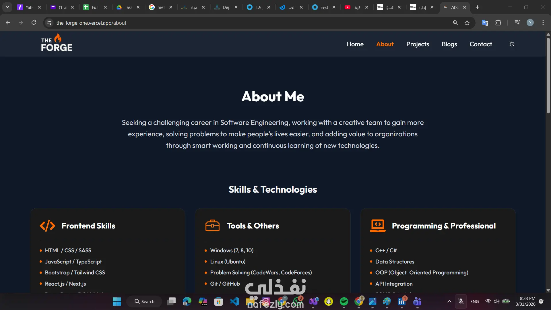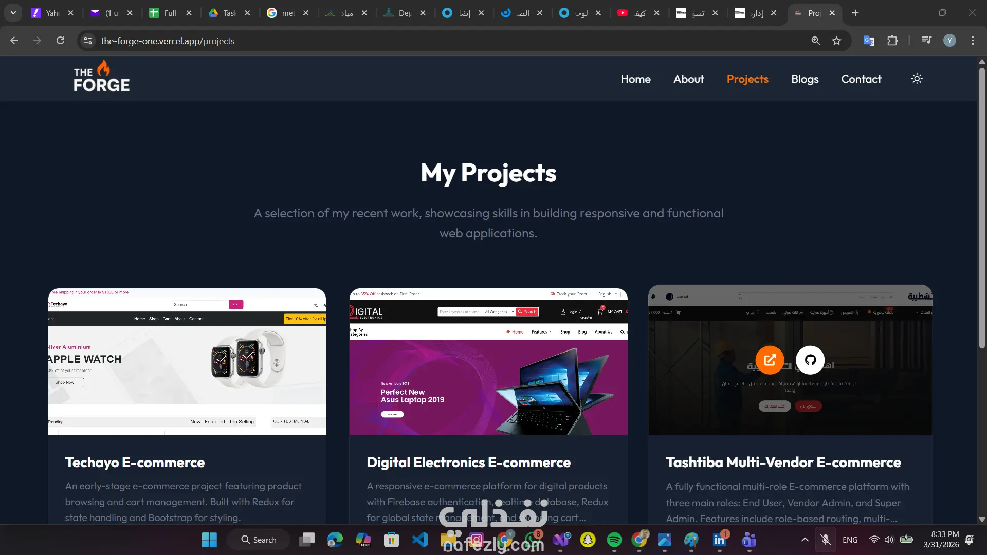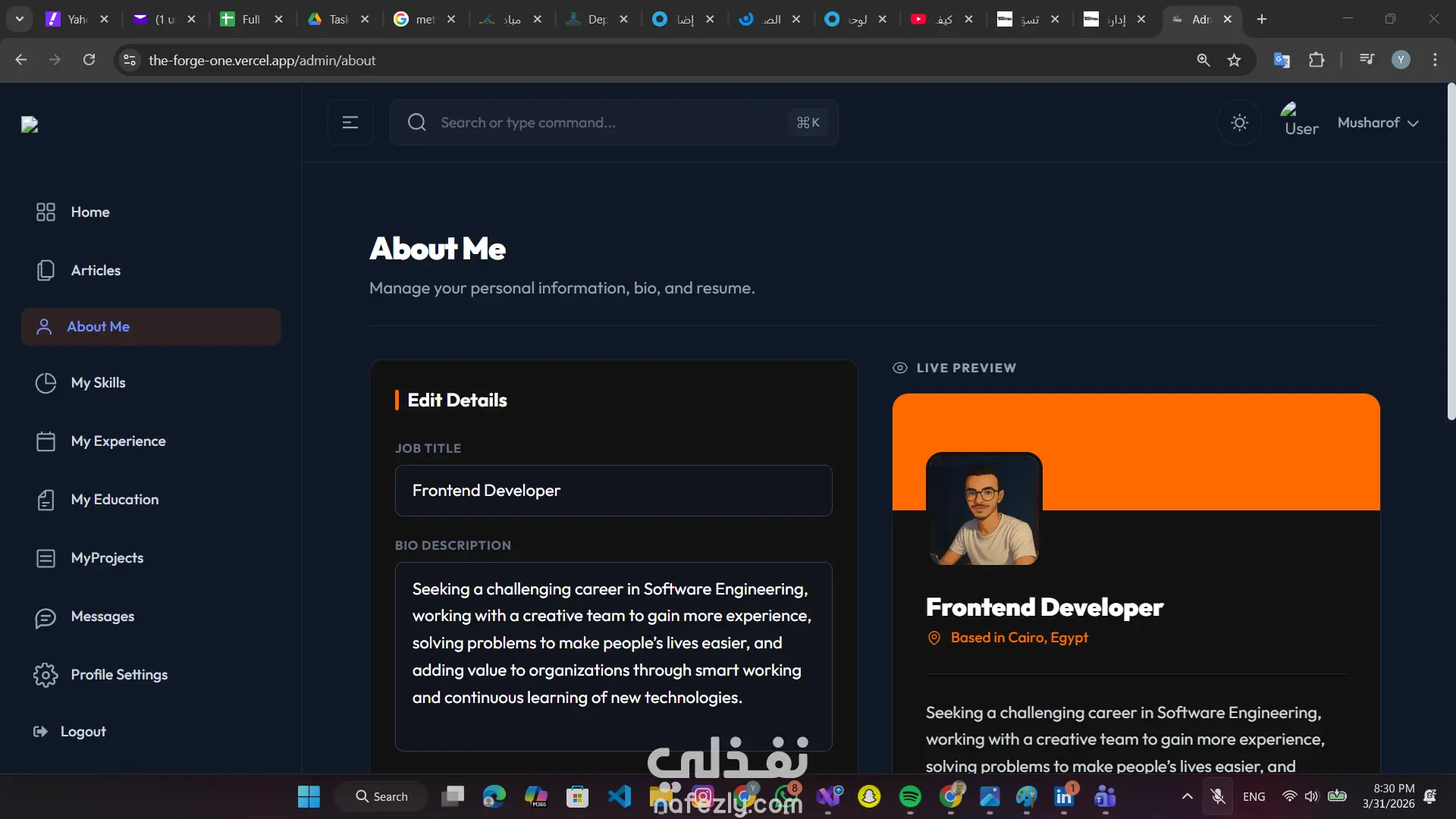 تطوير موقع شخصي تفاعلي يسمح بإدارة المحتوى (مشاريع، مقالات، مهارات) بشكل لحظي دون الحاجة لإعادة النشر. استخدام Next.js App Router و Server-Side Rendering لتحقيق أفضل أداء وتهيئة لمحركات البحث (SEO). إضافة لمسات جمالية وتفاعلية للمستخدم باستخدام مكتبة Framer Motion. المهارات المستخدمة: Next.js, TypeScript, Tailwind CSS, Framer Motion,laravel