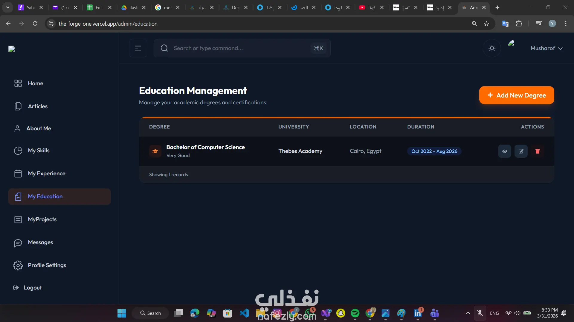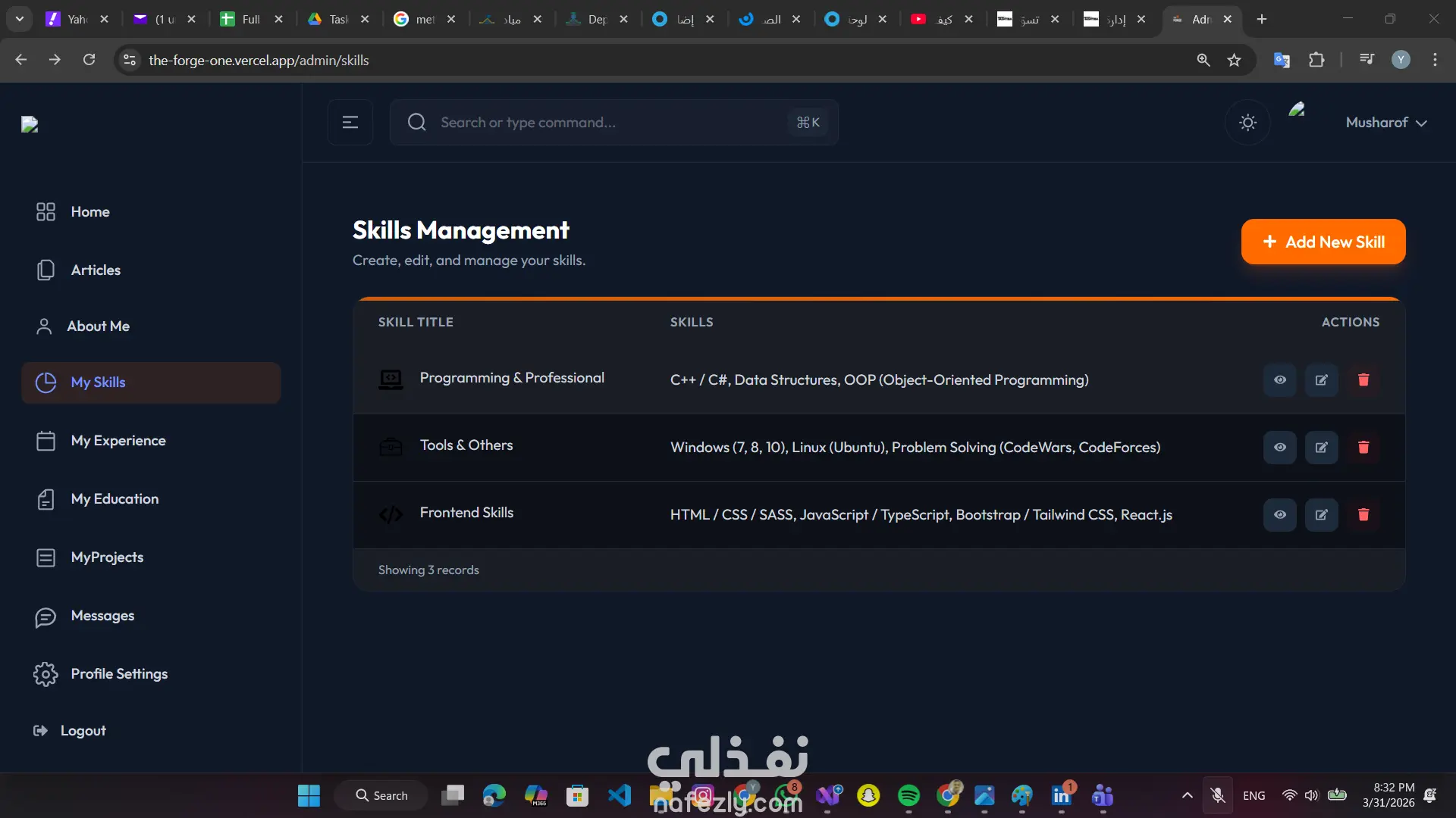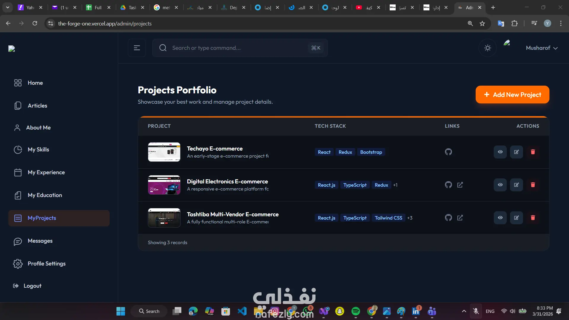 تطوير موقع شخصي تفاعلي يسمح بإدارة المحتوى (مشاريع، مقالات، مهارات) بشكل لحظي دون الحاجة لإعادة النشر. استخدام Next.js App Router و Server-Side Rendering لتحقيق أفضل أداء وتهيئة لمحركات البحث (SEO). إضافة لمسات جمالية وتفاعلية للمستخدم باستخدام مكتبة Framer Motion. المهارات المستخدمة: Next.js, TypeScript, Tailwind CSS, Framer Motion,laravel