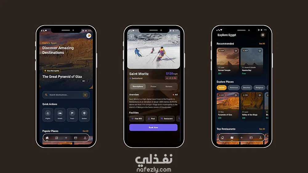 تطبيق سياحي ذكي يساعد المستخدمين على اكتشاف أفضل الوجهات السياحية في مصر مثل المعالم التاريخية والفنادق والمطاعم. يوفر التطبيق بحثًا ذكيًا وتوصيات مخصصة، بالإضافة إلى إمكانية إنشاء خطة رحلة تلقائيًا باستخدام الذكاء الاصطناعي بناءً على اهتمامات المستخدم. يتميز التطبيق بواجهة داكنة حديثة مع تجربة استخدام سلسة وحركات تفاعلية.