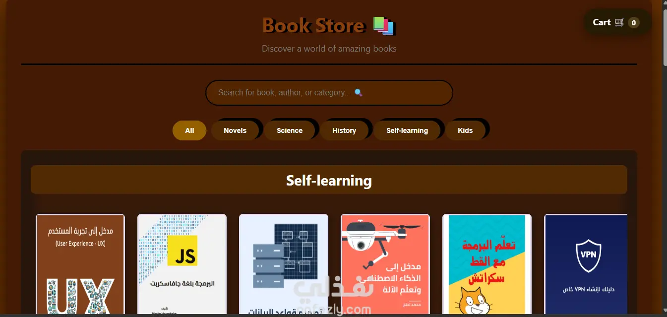 تصنيف وفلترة ذكية: إمكانية البحث عن الكتب بالاسم أو تصفحها حسب الفئة (روايات، علوم، إلخ) لسهولة الوصول