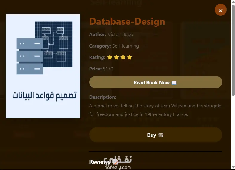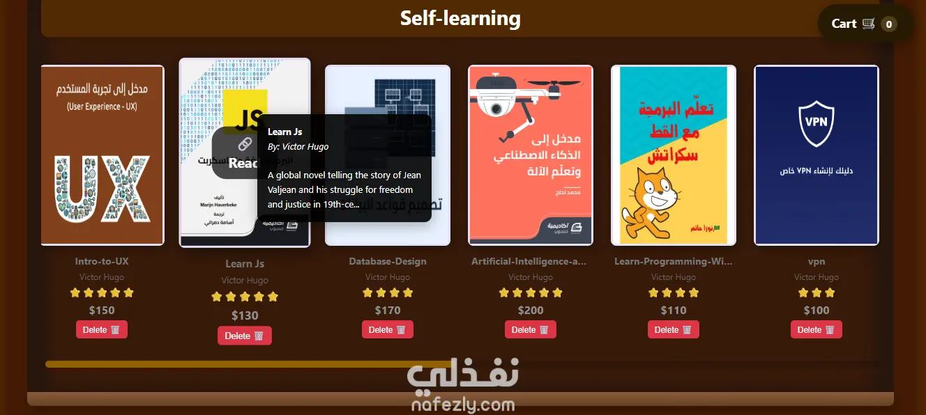 نظام إدارة المحتوى (Admin Side): لوحة تحكم تتيح إضافة كتب جديدة، رفع الأغلفة، تحديد الأسعار، أو حذف الكتب الموجودة مما يعكس مهاراتي في التعامل مع الـ Forms وقواعد البيانات