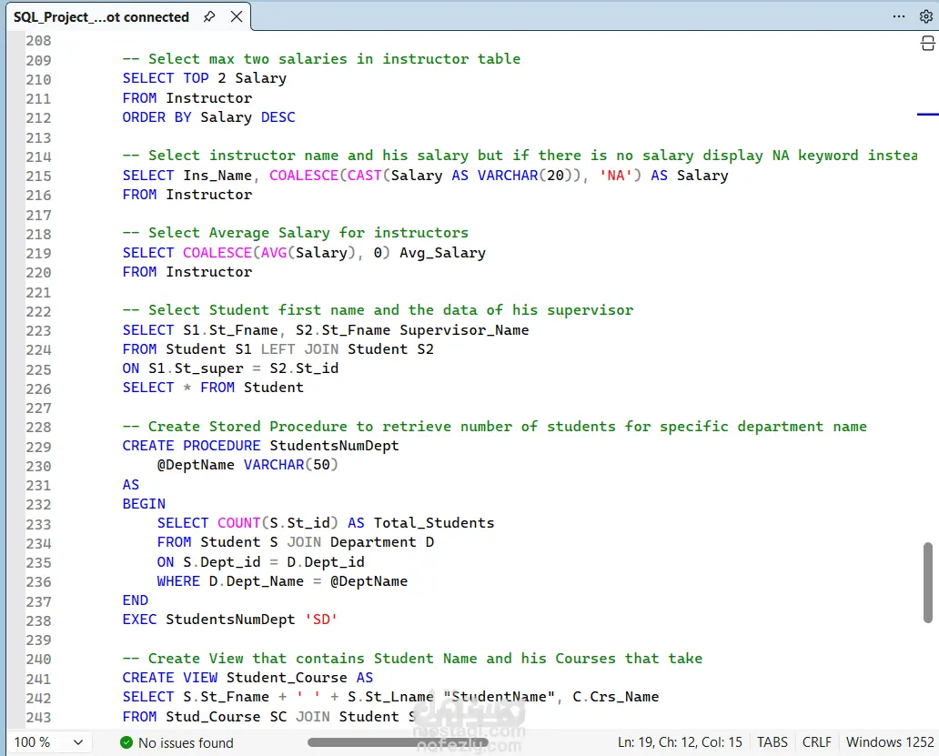 قمت بتصميم قاعدة بيانات كاملة باستخدام SQL Server تشمل إنشاء الجداول وربطها باستخدام Primary Key وForeign Key، بالإضافة إلى إدخال البيانات وكتابة مجموعة من الاستعلامات المختلفة لتحليل البيانات.
