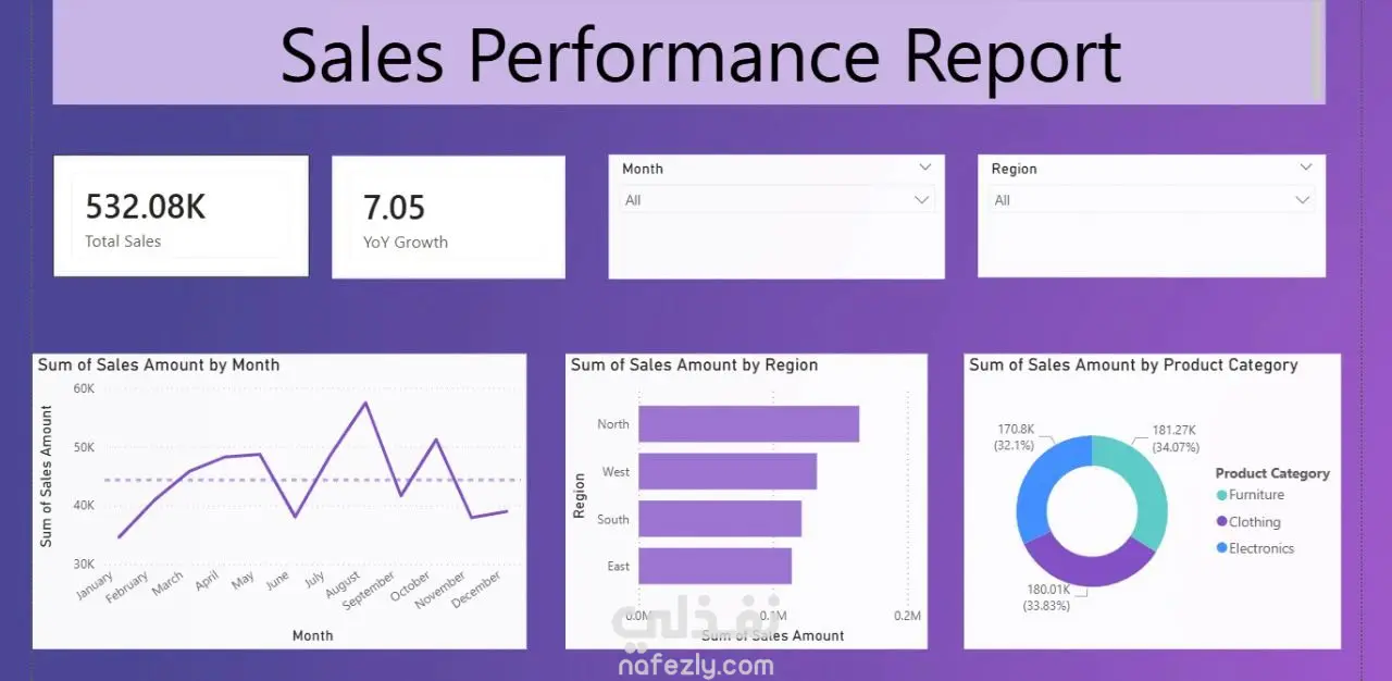 تفاعلية بالكامل: لوحة التحكم نشطة وتستجيب لاختيارات المستخدم فوراً. عند النقر على أي عنصر (مثل شهر محدد أو منطقة معينة)، يتم تحديث جميع الأرقام والرسوم البيانية في اللوحة لتعكس البيانات المتعلقة بهذا الاختيار فقط.مؤشرات الأداء الرئيسية (KPIs): عرض مؤشرات أداء حيوية مثل إجمالي المبيعات (Total Sales) ونمو المبيعات على أساس سنوي (YoY Growth).