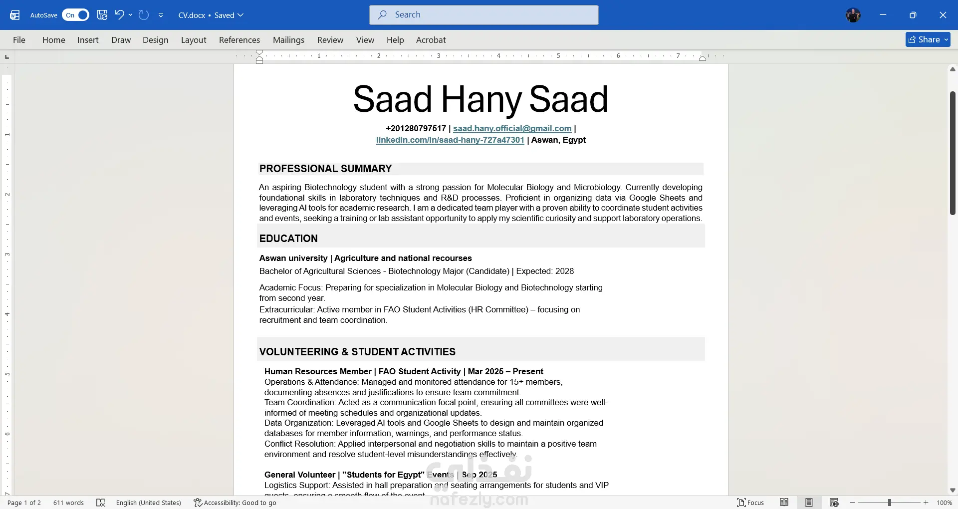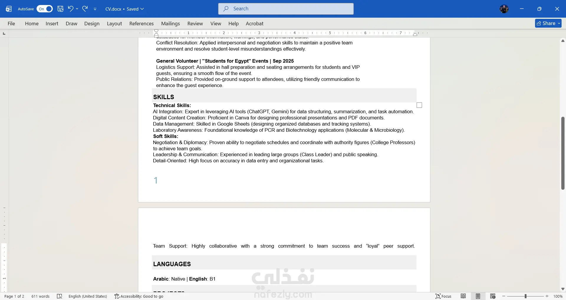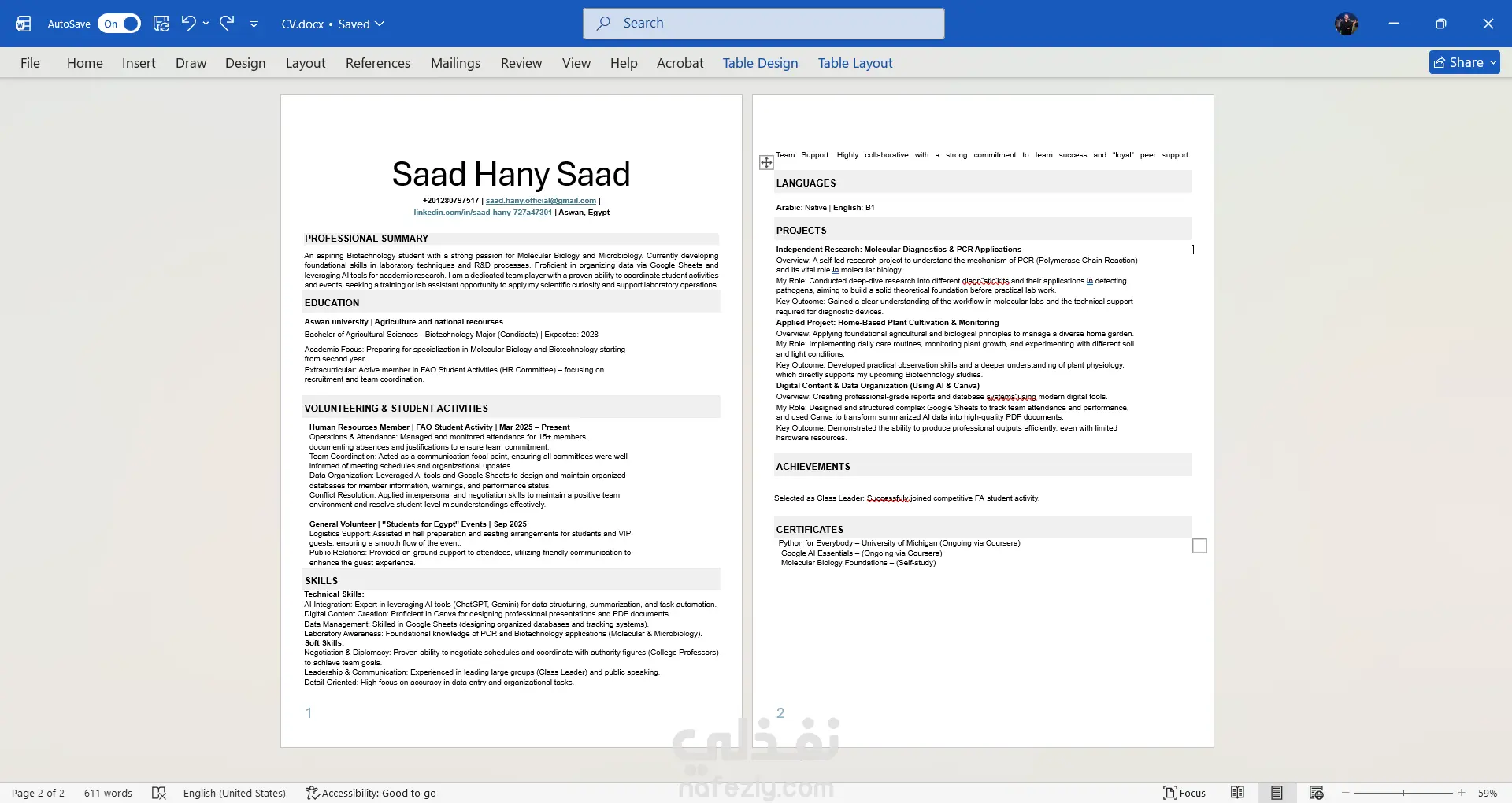 الهدف: تحويل الخبرات الأكاديمية والمهنية إلى وثيقة منظمة تجذب مسؤولي التوظيف. المهام المنفذة: صياغة المحتوى بأسلوب مهني يعتمد على مهارات التفاوض والتواصل الفعال. تنسيق البيانات بشكل دقيق ومنظم لضمان سهولة القراءة. استخدام أدوات التصميم لإخراج الملف بصيغة PDF عالية الجودة. الاعتماد على خبرتي كمسؤول موارد بشرية (HR) في فهم ما يتطلع إليه أصحاب العمل عند مراجعة الطلبات.