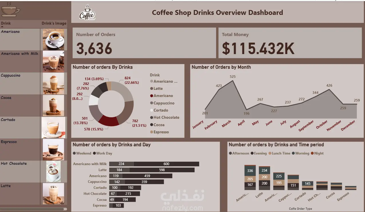 إنشاء داشبورد شامل لتحليل اتجاهات المبيعات لجميع المشروبات. تقسيم البيانات حسب أوقات اليوم المختلفة لتحديد ساعات الذروة لكل نوع مشروب. إضافة تحليل موسمي لمعرفة أكثر المشروبات مبيعًا في كل موسم خلال السنة. تصميم داشبورد رئيسي يوضح مقارنة شاملة بين جميع المشروبات بشكل واضح وسهل. إنشاء مؤشرات أداء (KPIs) لمتابعة توزيع الأسعار، عدد الوحدات المباعة، والربح لكل مشروب.