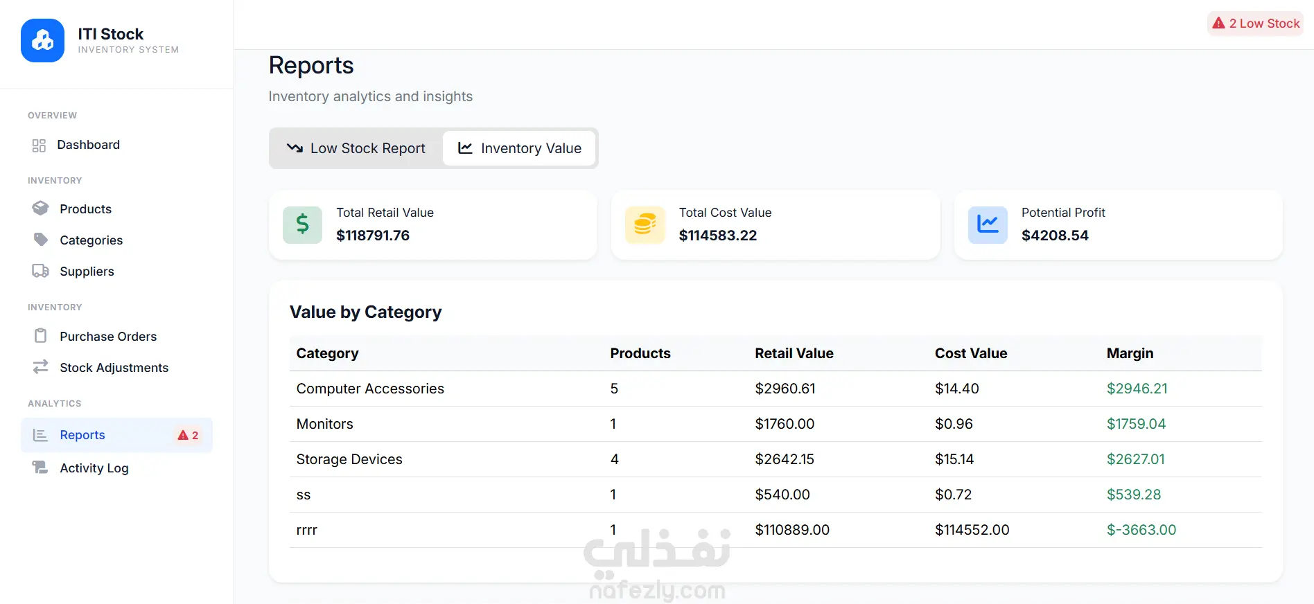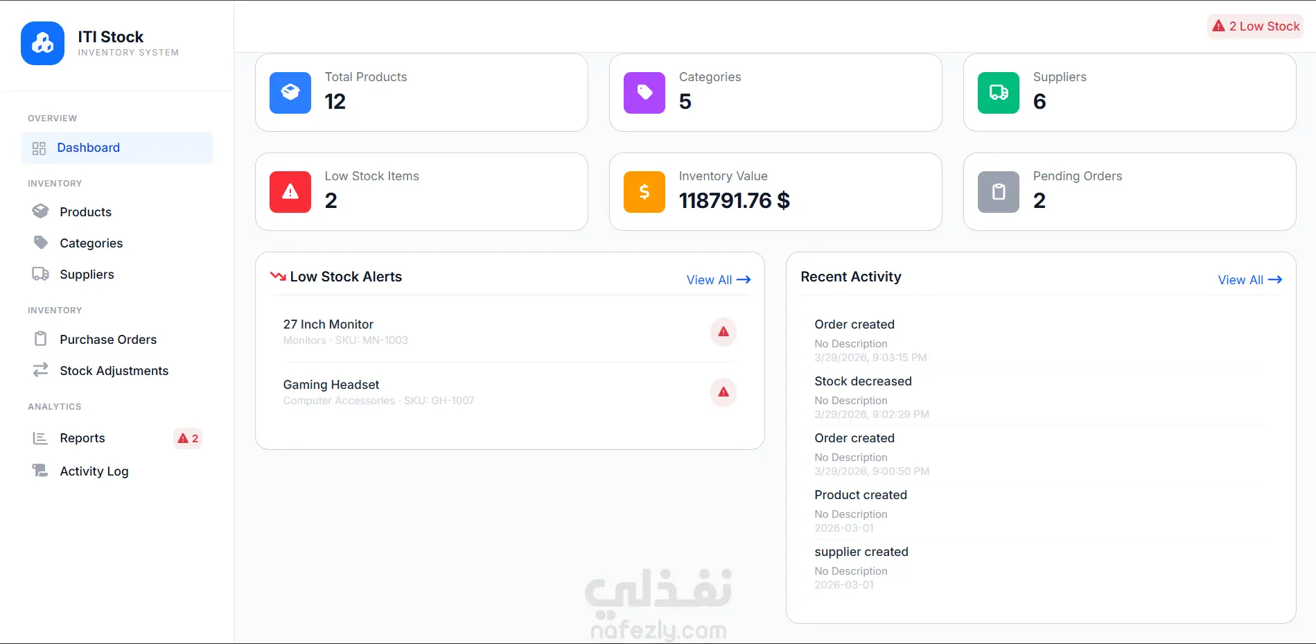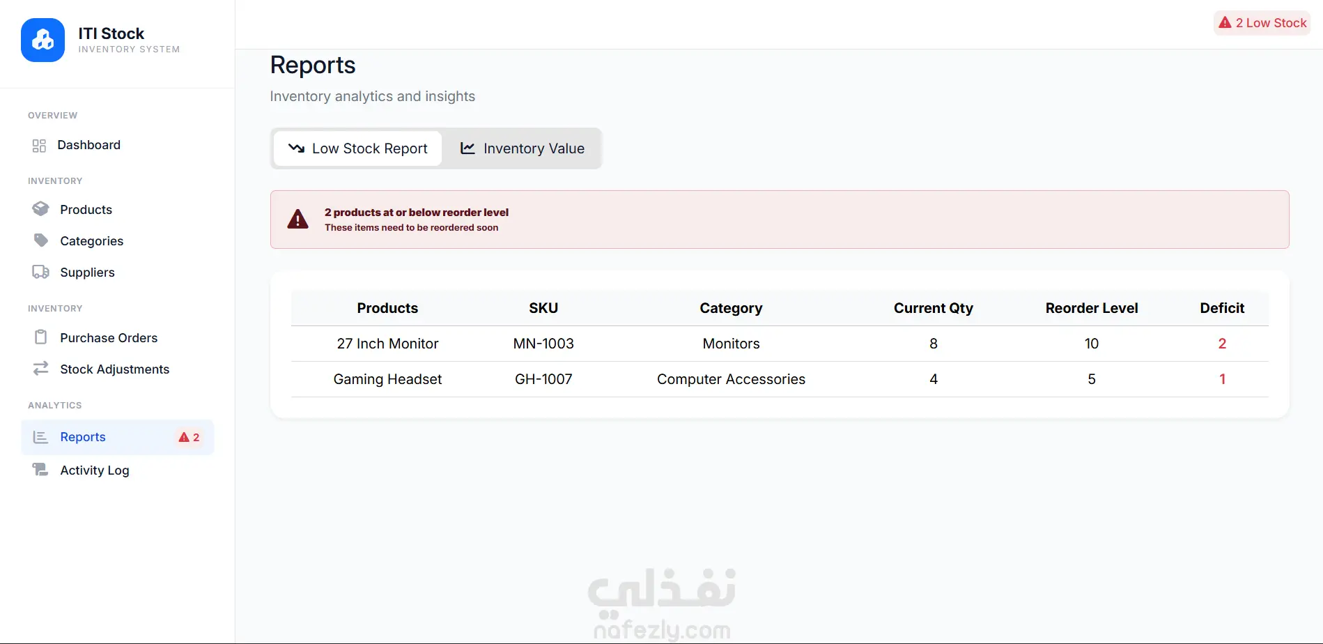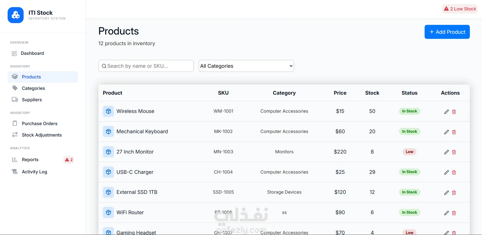 نظام إدارة مخازن (Inventory Management System) هو تطبيق ويب لإدارة المنتجات داخل المخزن بشكل سهل ومنظم، حيث يتيح إضافة المنتجات، تعديلها، حذفها، ومتابعة الكميات المتاحة، مما يساعد على تنظيم عمليات المخزون وتقليل الأخطاء اليدوية. تم تطوير المشروع باستخدام تقنيات الويب مثل JavaScript و HTML و CSS و jQuery و Bootstrap و JSON Server لبناء واجهة مستخدم تفاعلية وربطها بقاعدة بيانات وهمية لتجربة عمليات الإضافة والتعديل والحذف. -مميزات النظام إضافة منتجات جديدة إلى المخزن تعديل بيانات المنتجات حذف المنتجات عرض جميع المنتجات في جدول البحث عن منتج متابعة الكمية المتاحة في المخزن واجهة مستخدم سهلة وبسيطة نظام CRUD كامل (Create, Read, Update, Delete) ربط الواجهة مع API باستخدام JSON Server