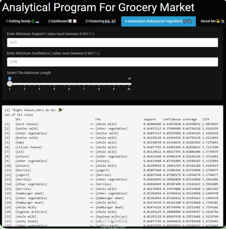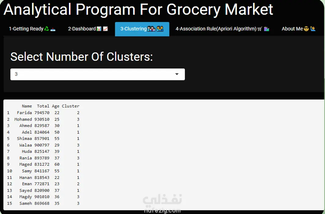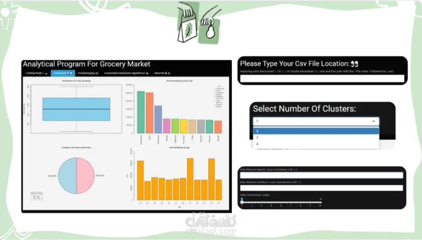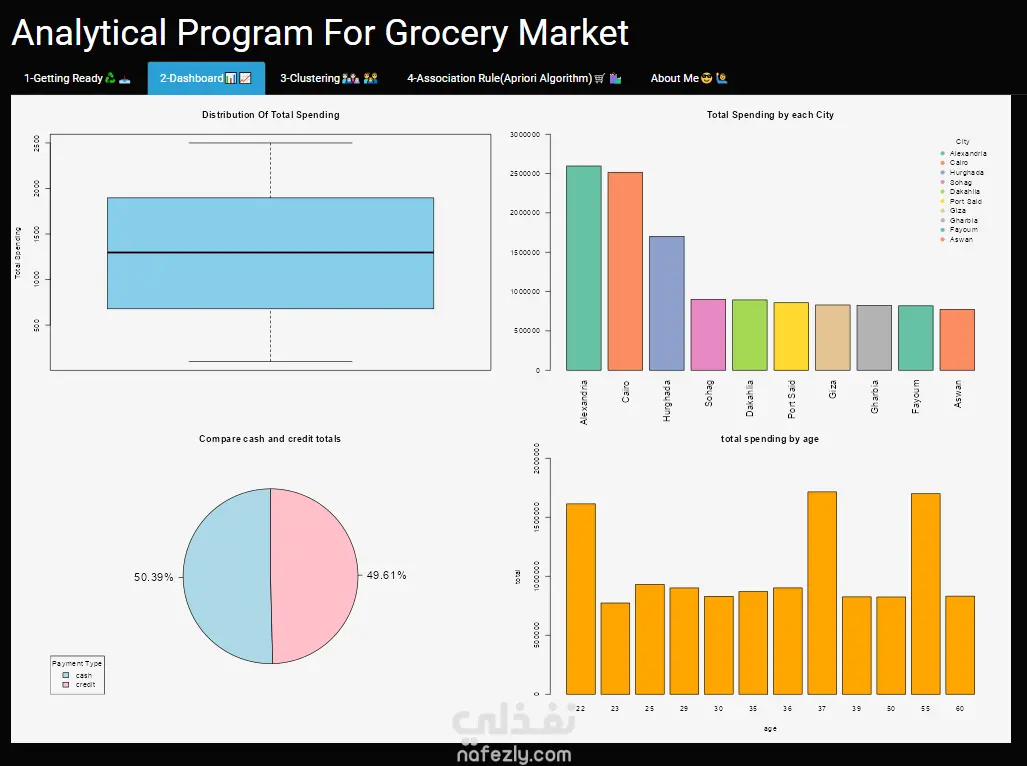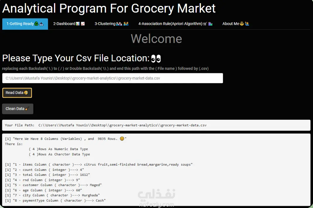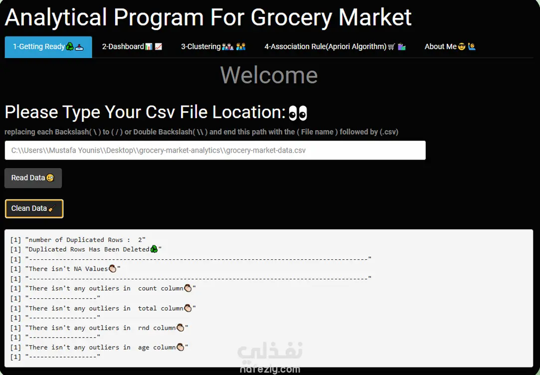 نظام تحليل بيانات سوق البقالة الذكي (Grocery Market Analytics System) هو نظام تفاعلي تم تطويره باستخدام لغة R وإطار عمل Shiny، يهدف إلى تحويل بيانات المبيعات الخام إلى رؤى تحليلية تساعد في فهم سلوك العملاء واتخاذ قرارات تجارية أفضل. يقوم النظام بمعالجة البيانات بدءًا من تنظيف البيانات (Data Cleaning) عبر إزالة القيم المكررة، القيم المفقودة (NA)، والقيم الشاذة (Outliers)، ثم عرض البيانات في شكل لوحات تحليلية تفاعلية (Analytics Dashboard) تشمل مقارنة الإنفاق حسب العمر، المدينة، وطريقة الدفع. يعتمد التطبيق على تقنيات تحليل البيانات المتقدمة مثل: Clustering باستخدام K-Means لتقسيم العملاء بناءً على سلوكهم الشرائي Association Rules باستخدام Apriori Algorithm لاكتشاف العلاقات بين المنتجات الأكثر شراءً معًا (Market Basket Analysis) كما يتيح النظام للمستخدم التحكم في مدخلات التحليل مثل عدد الـ clusters وقيم الـ support و confidence، مما يوفر مرونة عالية في استخراج النتائج. يساعد هذا التطبيق أصحاب المتاجر والشركات على: فهم سلوك العملاء بشكل أعمق تحسين استراتيجيات التسويق والعروض زيادة المبيعات من خلال تحليل المنتجات المرتبطة