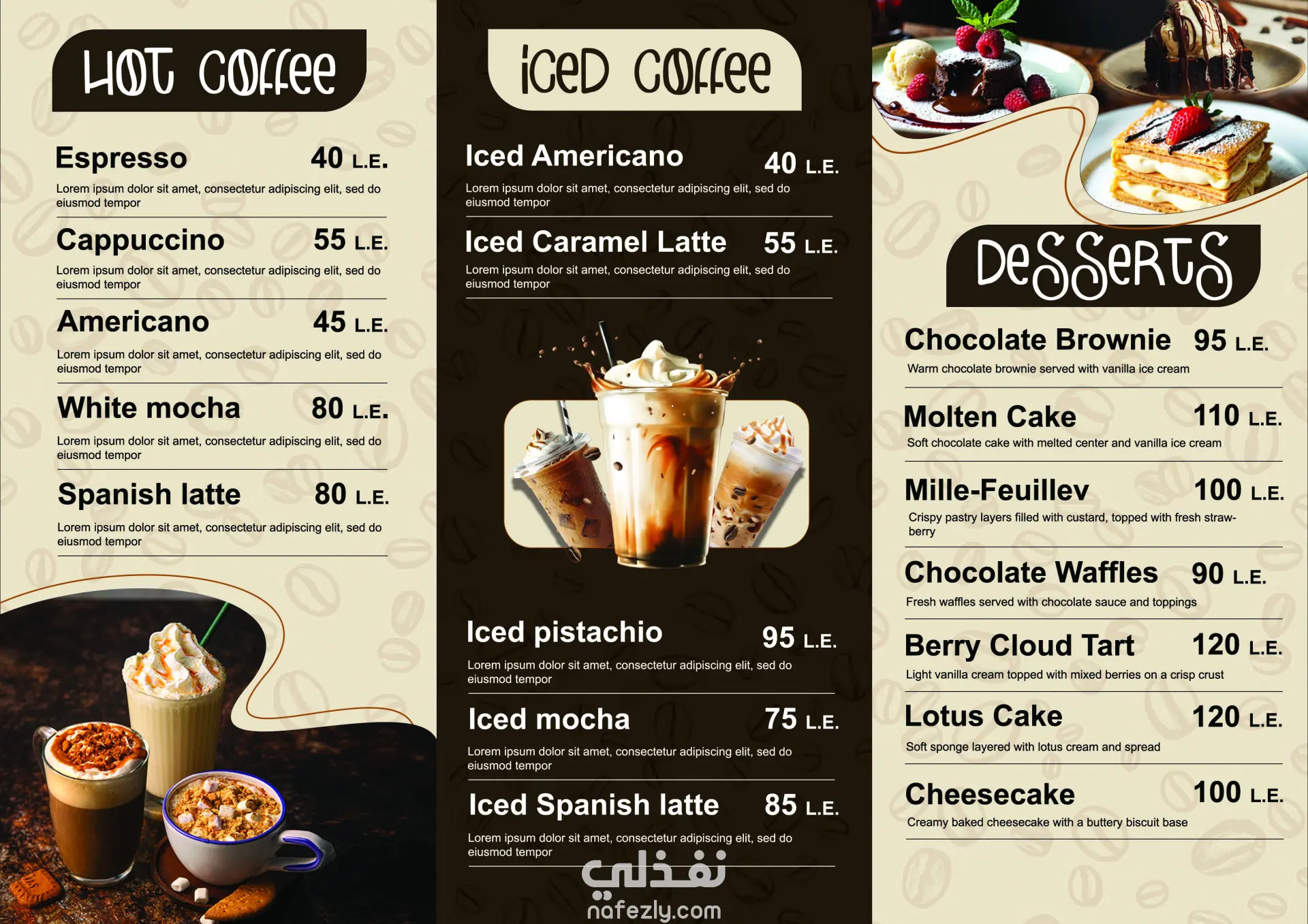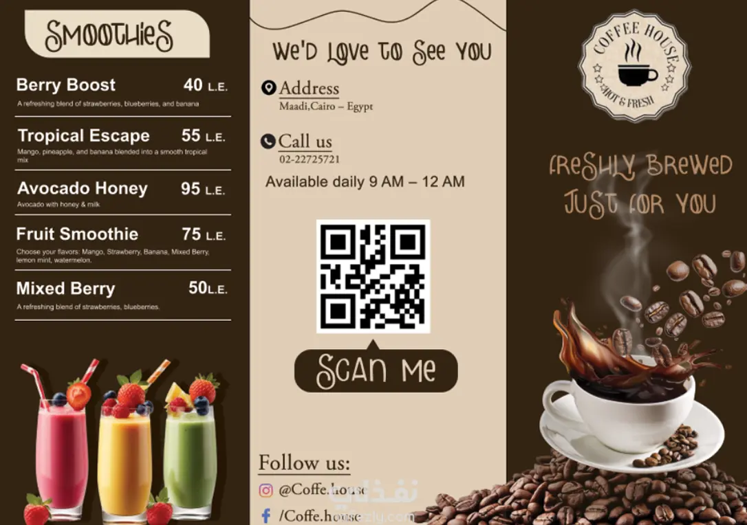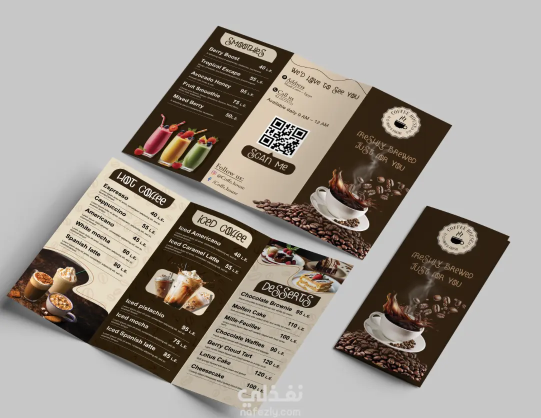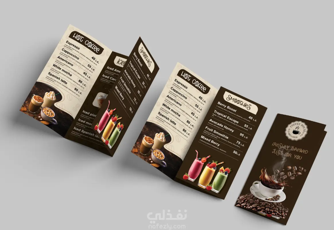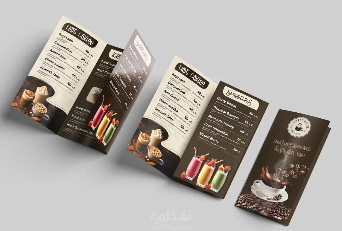 تصميم منيو بشكل عصري وبسيط يركز على وضوح المحتوى وتنظيم العناصر، مع الاهتمام بتوزيع النصوص والصور بشكل مريح للعين. التصميم مناسب للطباعة (CMYK) وكمان للاستخدام الرقمي.