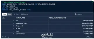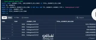 كانت مهمتي استخراج معلومات محددة من الجدول باستخدام استعلامات SQL، مثل تحديد أكثر وسائل النقل شعبية عبر كامل الفترة الزمنية الموجودة في الجدول، وتحديد السنوات الخمس التي سجلت أقل عدد من الرحلات باستخدام Underground وDLR، وكذلك تحديد الأشهر والسنوات الخمس التي كانت الأكثر استخدامًا لخدمة Emirates Air Line.