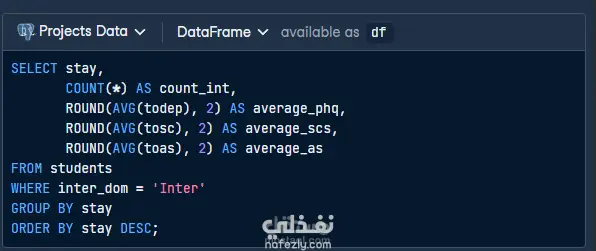 كان هذا المشروع جزءًا من مسار Data Engineer Associate الذي أكملته على منصة Datacamp. عملت خلاله على مجموعة بيانات تضم معلومات عن طلاب شاركوا في دراسة تتعلق بالصحة النفسية، وتشمل مدة إقامتهم في الخارج بالإضافة إلى نتائج عدة اختبارات تشخيصية.