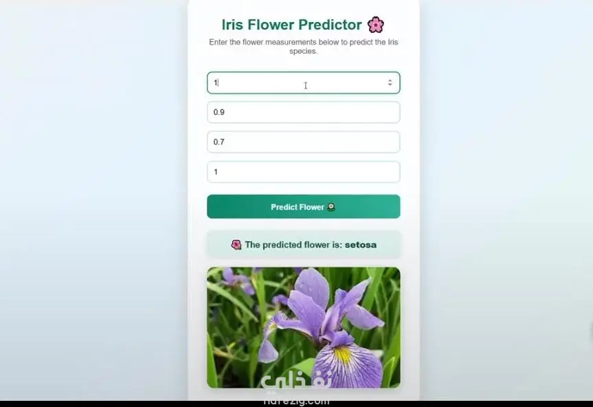 Machine learning web app that predicts Iris species using a trained model integrated with a Flask API. Interactive front end built with HTML, CSS, and JavaScript for real-time predictions. Clean responsive UI with animations and dynamic visuals for an engaging user experience.