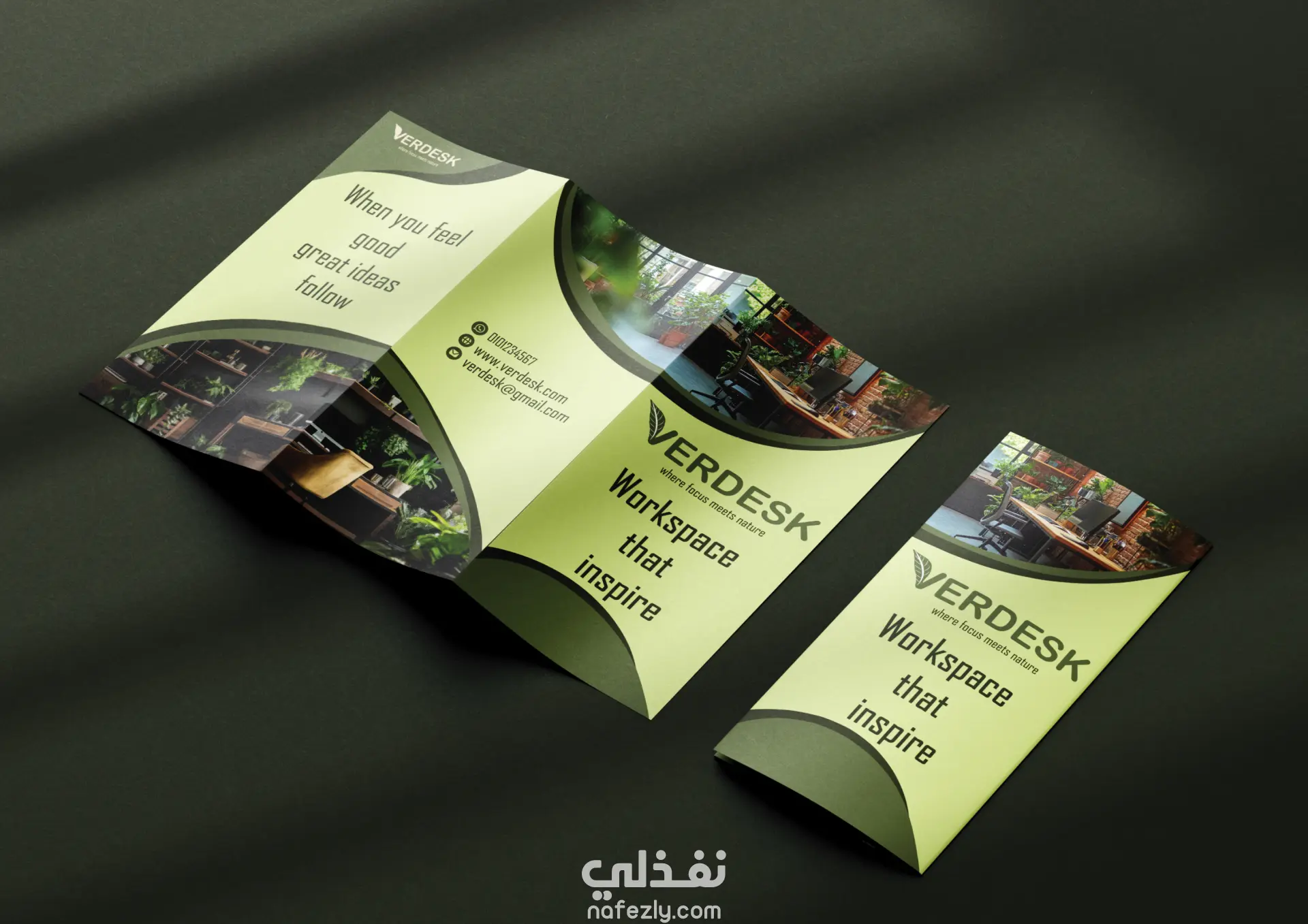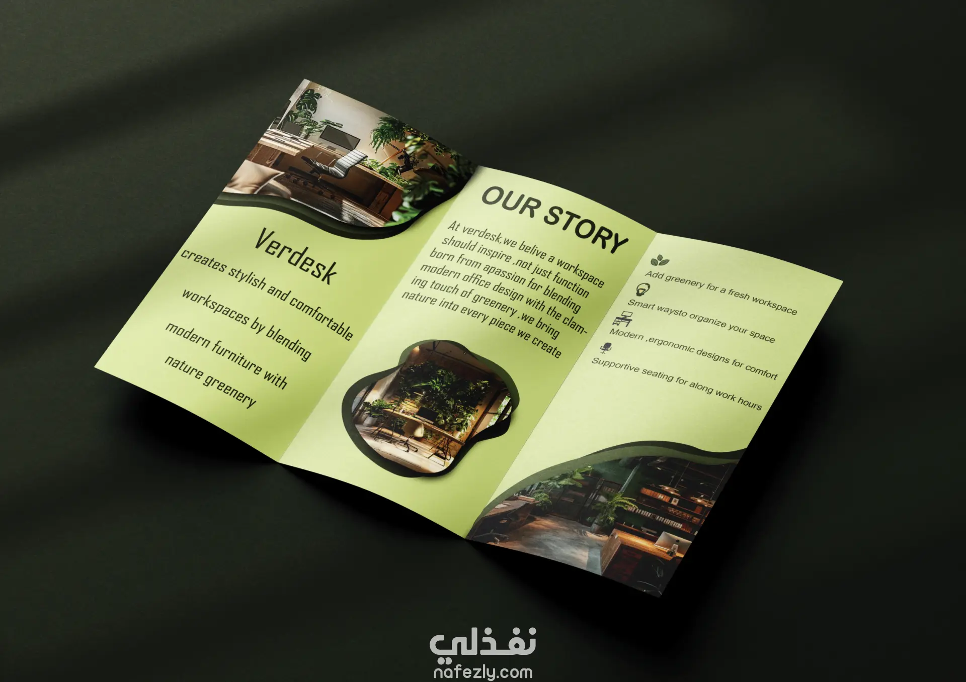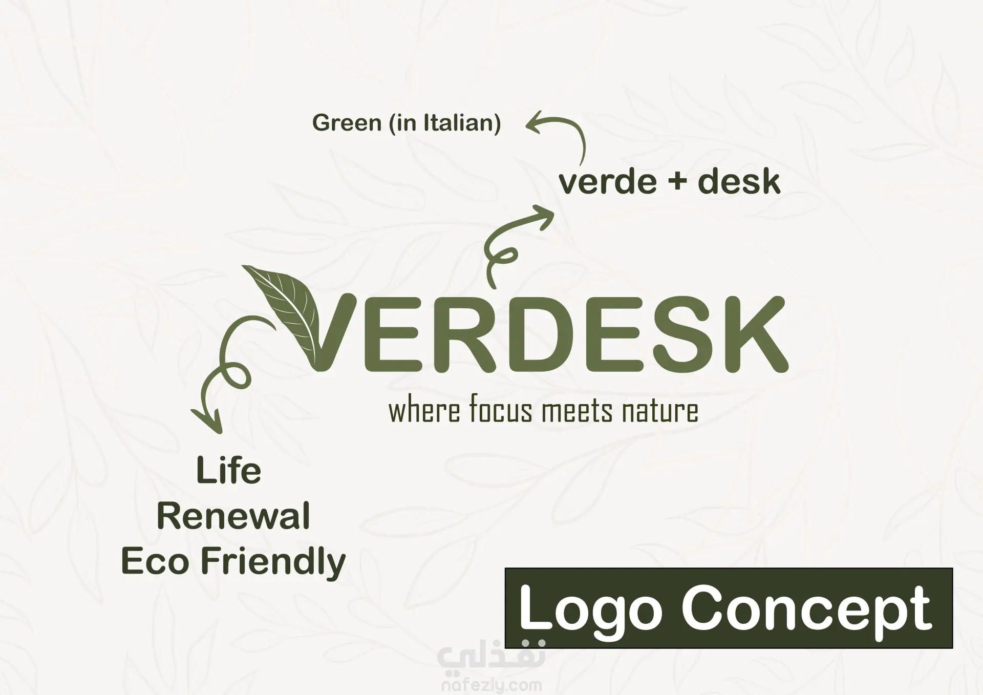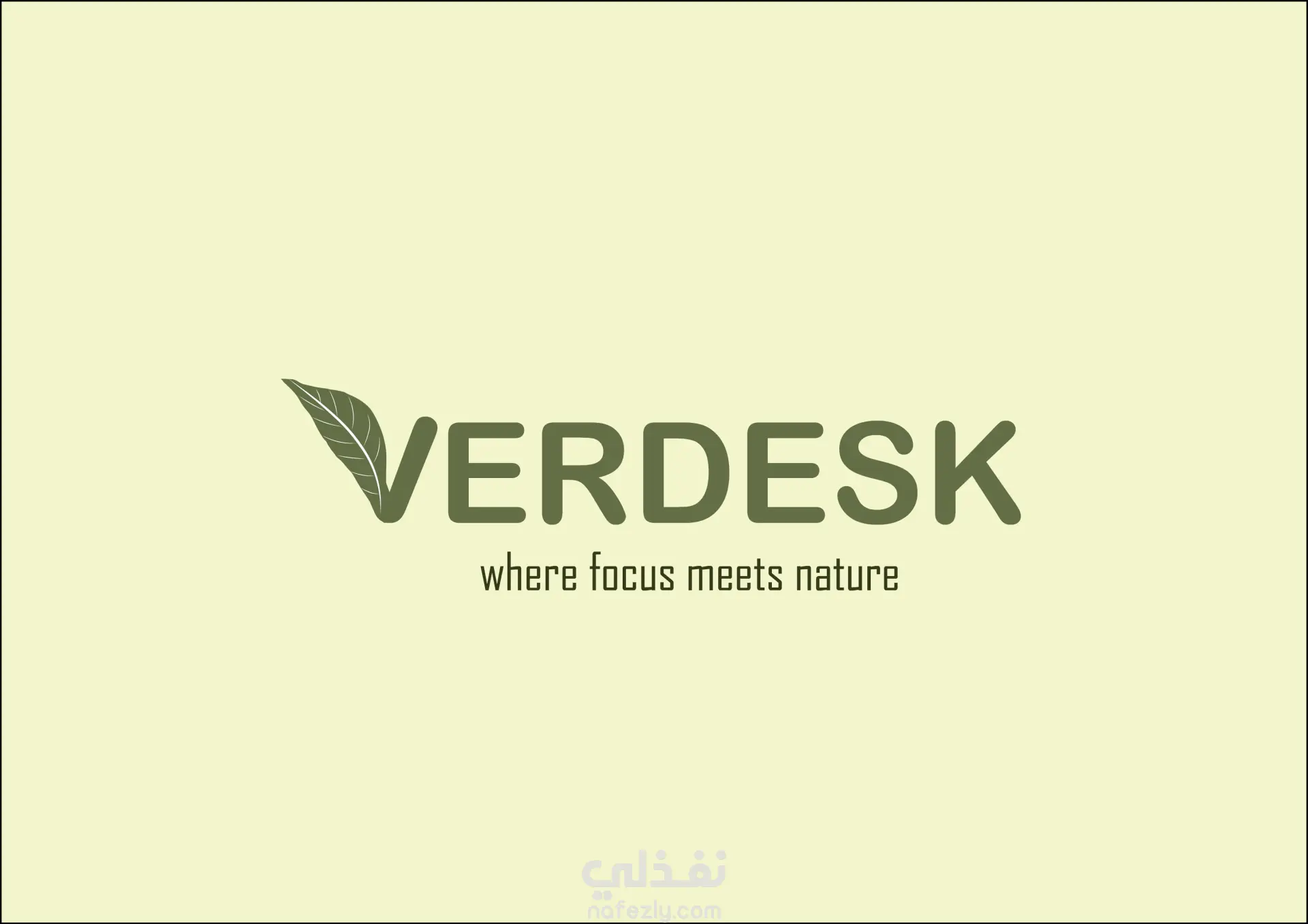 شرح فلسفة الشعار الذي يدمج بين كلمة "Verde" (أخضر بالايطالية) و "Desk"، مع دمج عناصر الطبيعة لتعكس مفهوم "Eco-friendly".