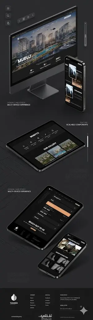 يعتمد التصميم على النمط الداكن (Dark Theme) مع تباين عالٍ لإبراز الفخامة والحداثة. تم دمج الصور السينمائية العريضة مع تخطيط شبكي (Grid Layout) دقيق ومنظم، مما يعكس القوة والاستقرار في الهوية البصرية للشركة.