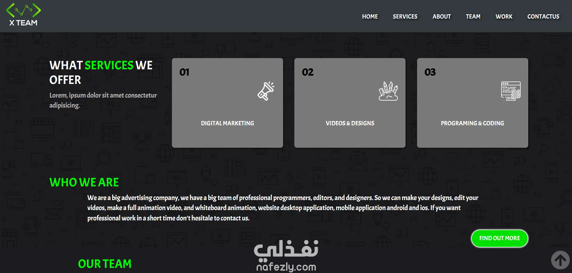 موقع تعريفي لشركه X-Team للكورسات يستعرض الشركه والاعمال والخدمات والمسؤولين بها والملف التعريفي الخاص بها