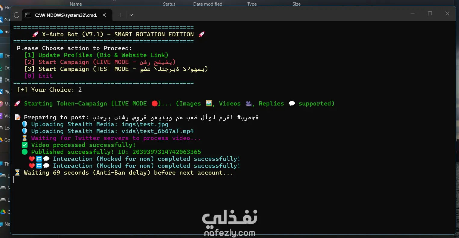 I developed an advanced Python script to fully automate posting and engagement operations on X (formerly Twitter). The bot is designed to manage large-scale marketing and interaction campaigns autonomously, with a strict focus on high-security standards and anti-ban mechanisms to protect user accounts. Key Technical Features: Multi-Account Support: Seamlessly manages and switches between a large volume of accounts during a single campaign. Smart Randomized Content: Dynamically pulls text, images, and videos from dedicated directories to ensure content diversity and avoid spam detection. Automated Engagement: Executes Likes, Retweets, and Replies automatically immediately after posting. Advanced Anti-Ban System: Integrates randomized delays and infinite loops to perfectly simulate natural human behavior. Proxy Integration: Assigns dedicated proxies to individual accounts to ensure network isolation and prevent mass suspensions. Interactive CLI: Features a colorful, user-friendly Command Line Interface allowing clients to switch between "Mock/Test Mode" and "Live Mode" while monitoring operations in real-time. Technologies Used: Python 3 X (Twitter) REST APIs & GraphQL integration Core Libraries: requests, colorama, json, uuid Note: The project was successfully delivered with comprehensive technical support, including remote environment setup on the client's machine to ensure seamless deployment and operation.