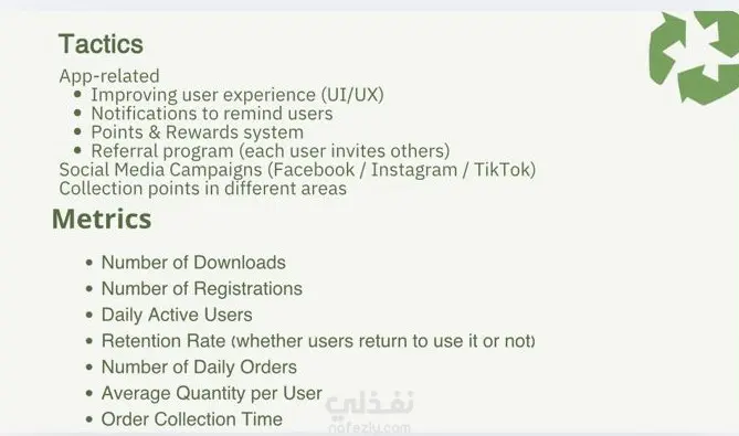 قمت بإعداد استراتيجية متكاملة لمشروع في مجال إعادة التدوير، شملت بناء الرؤية التسويقية وتحديد أساليب النمو والتوسع، مع وضع KPIs واضحة لقياس الأداء مثل عدد المستخدمين النشطين، عدد عمليات إعادة التدوير، الشراكات، ومناطق التغطية. كما تضمن العمل استخدام أدوات تحليل استراتيجي مثل BCG Matrix وVRIO Analysis لتقييم وضع المشروع وفرصه التنافسية في السوق. إضافة إلى ذلك، قمت بإعداد Tactics وMetrics خاصة بالتطبيق والحملات الرقمية، مع كتابة سيناريو إعلاني وStoryboard لفيديو تسويقي يوضح رحلة العميل وطريقة استخدام التطبيق بشكل مبسط وجذاب