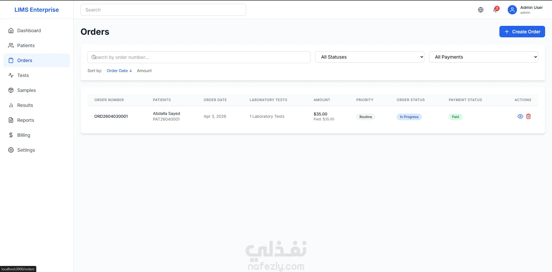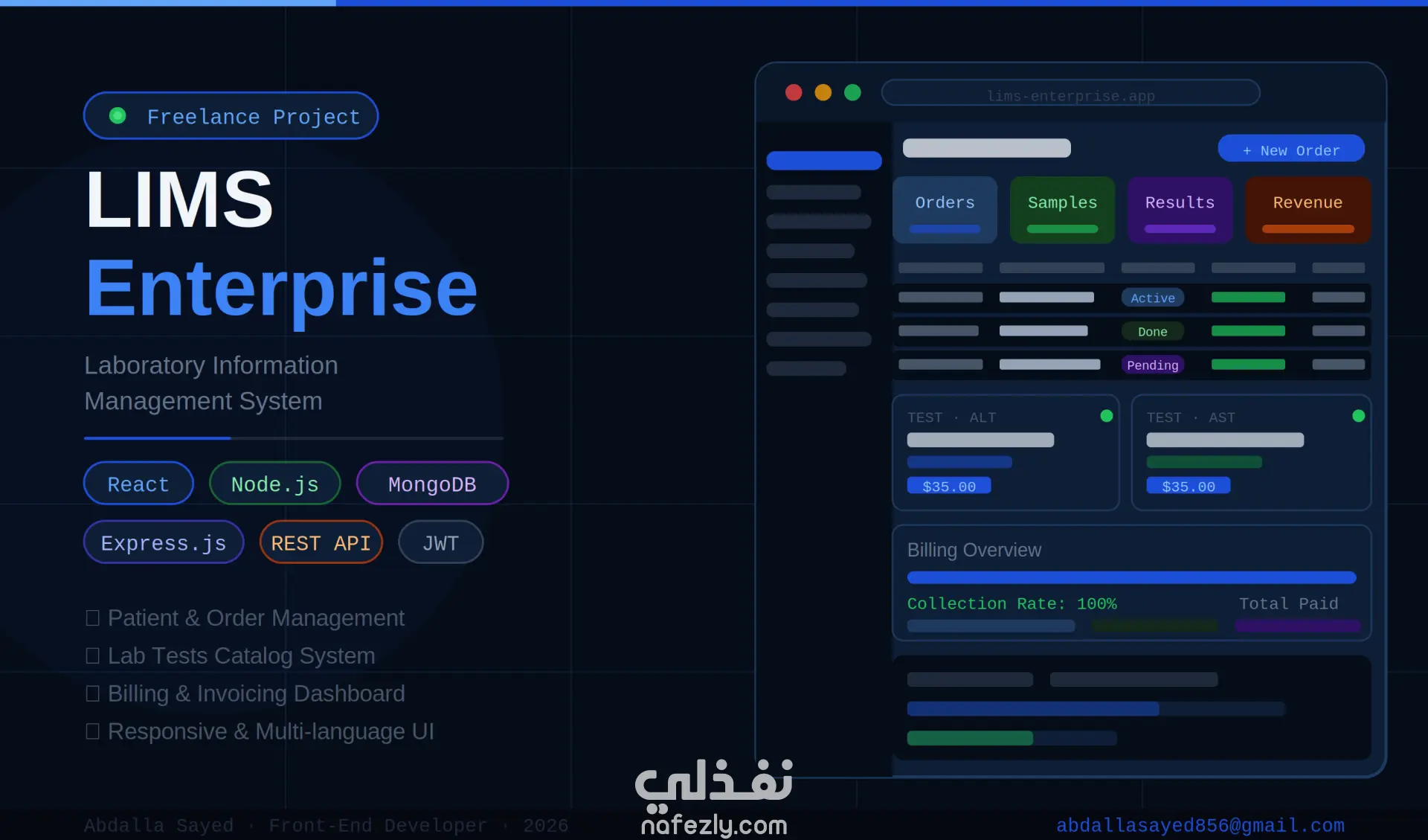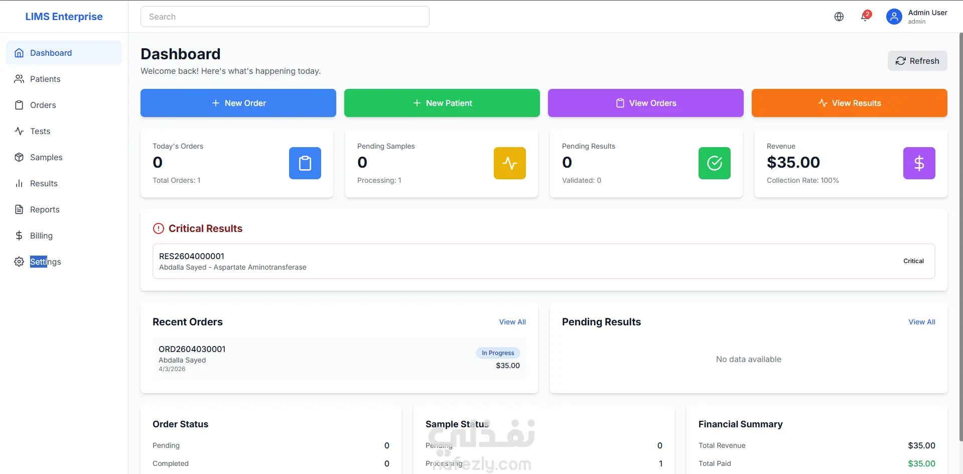 نظام إدارة معلومات المختبرات (LIMS) هو تطبيق ويب متكامل Full-Stack، مصمم لتحسين كفاءة إدارة المختبرات الطبية وتبسيط العمليات اليومية بواجهة مستخدم احترافية وسهلة الاستخدام.