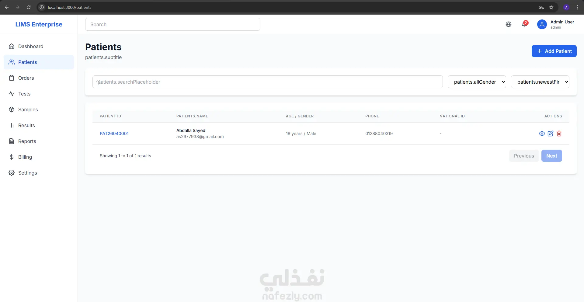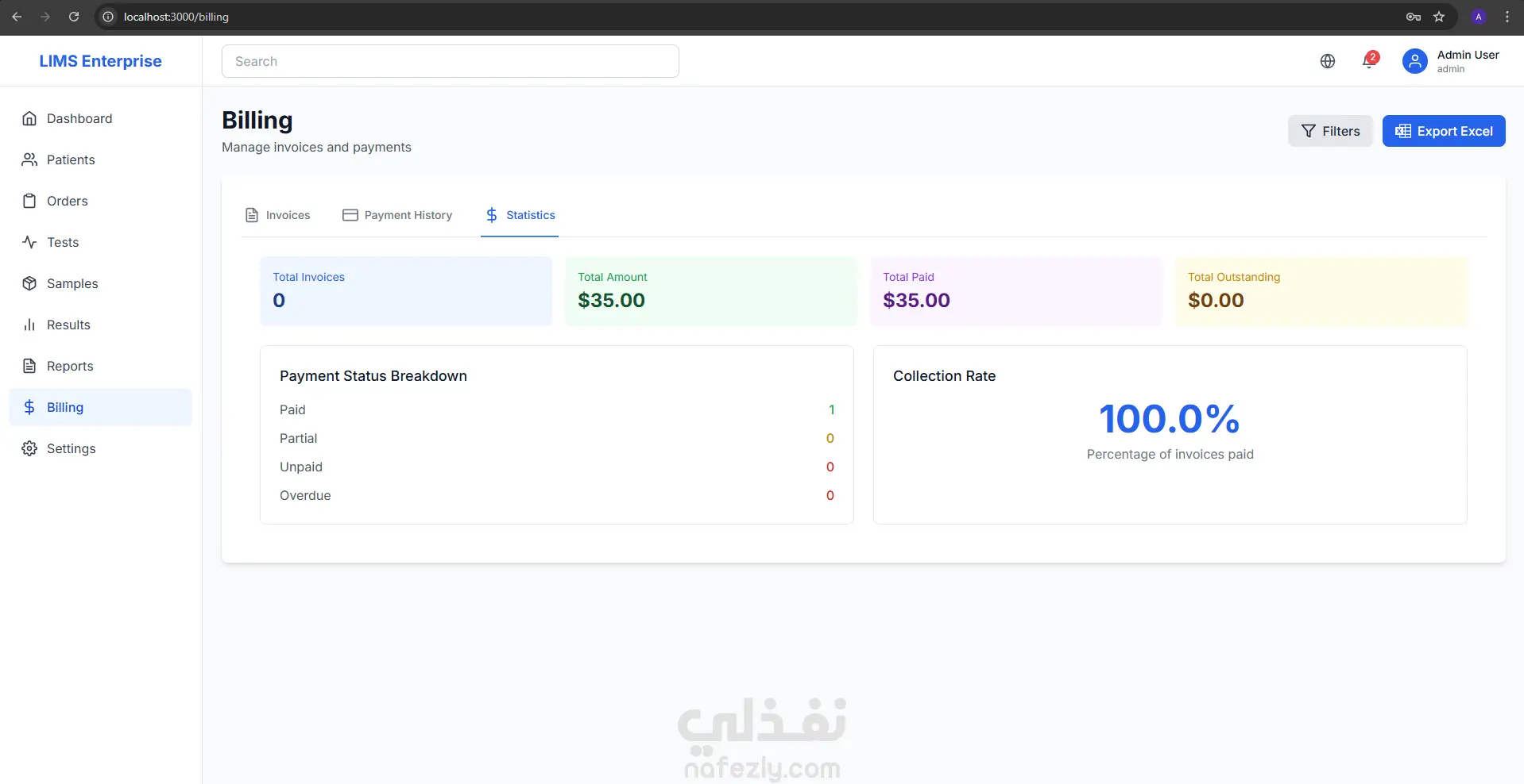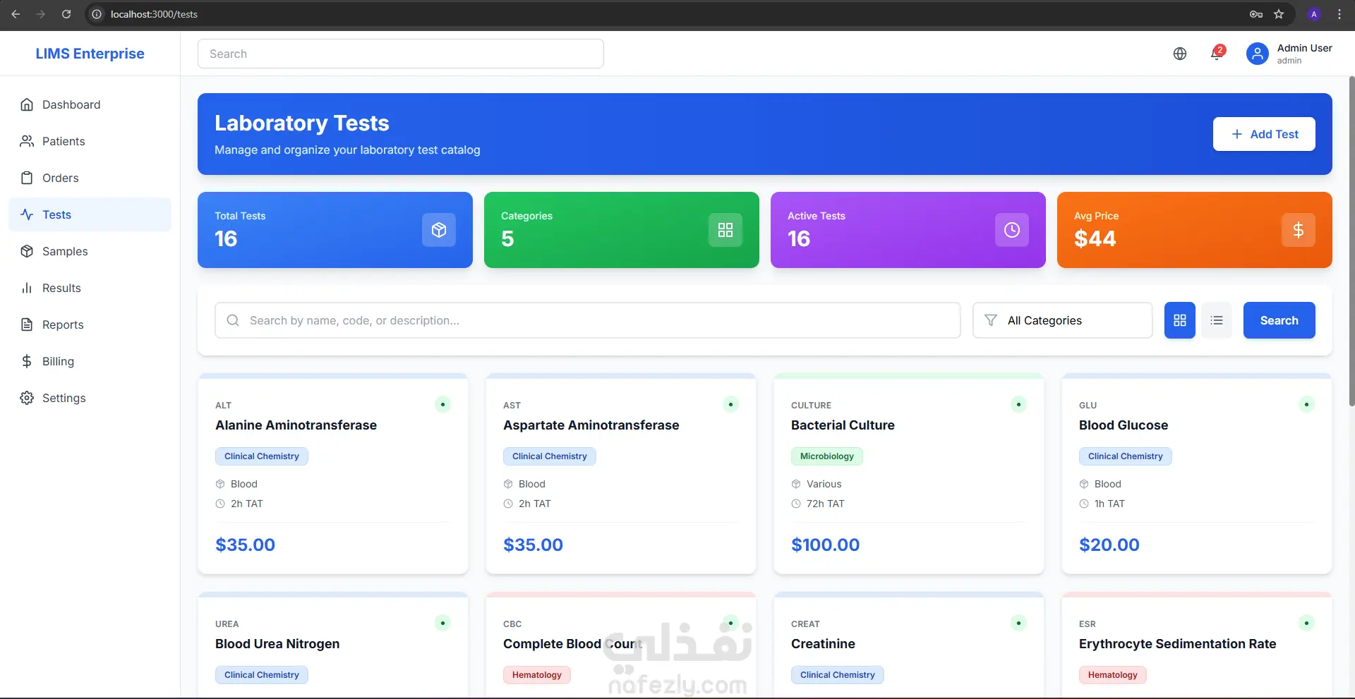 نظام إدارة معلومات المختبرات (LIMS) هو تطبيق ويب متكامل Full-Stack، مصمم لتحسين كفاءة إدارة المختبرات الطبية وتبسيط العمليات اليومية بواجهة مستخدم احترافية وسهلة الاستخدام.