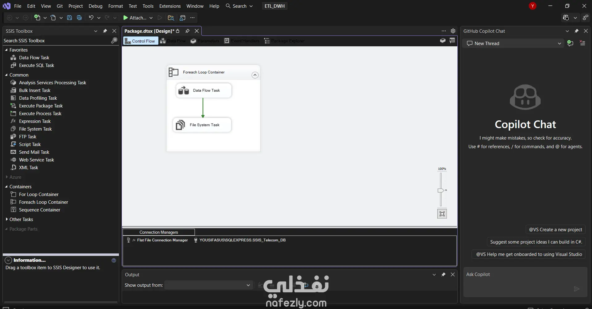 تم تصميم وتنفيذ حل متكامل لعمليات الاستخراج والتحويل والتحميل (ETL) باستخدام SQL Server Integration Services (SSIS) داخل Visual Studio، وذلك لمعالجة ملفات CSV الخاصة بقطاع الاتصالات وتحميلها إلى مستودع بيانات (Data Warehouse).