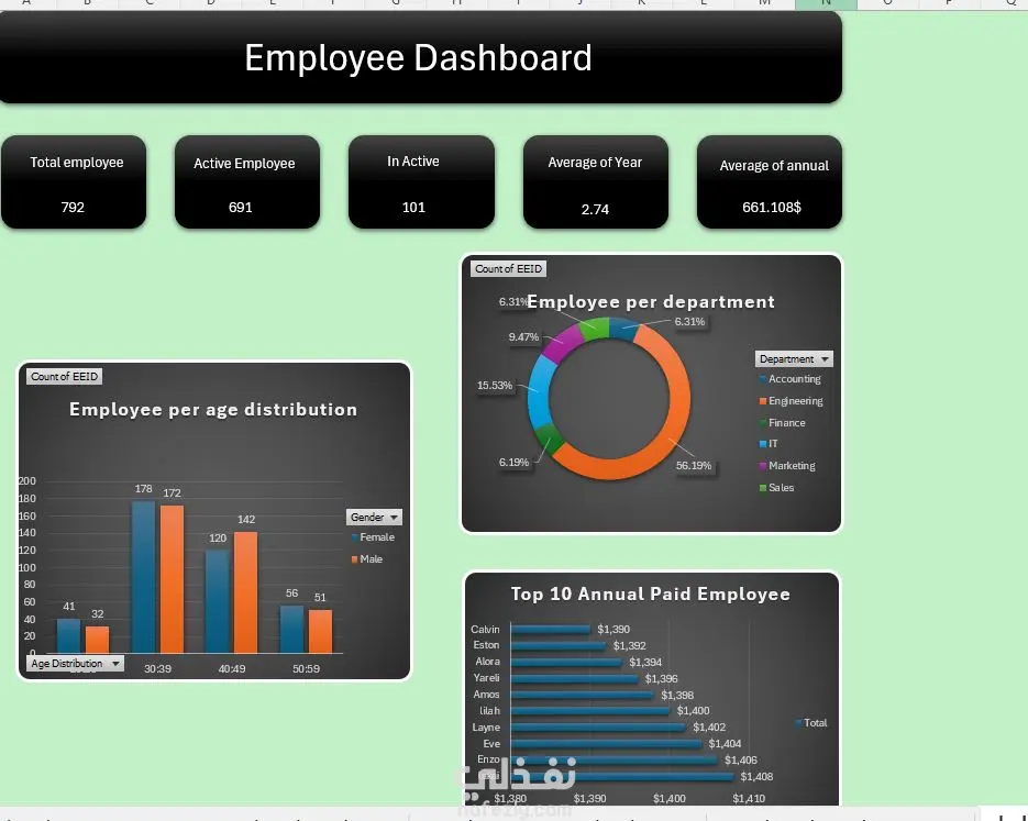 قمت بتصميم وتطوير لوحة تحكم تفاعلية لتحليل بيانات الموارد البشرية بهدف متابعة توزيع الموظفين، قياس الأداء، وتحليل الرواتب لدعم اتخاذ القرارات الإدارية. تعرض لوحة التحكم مؤشرات أداء رئيسية توضح الحا? أهم المؤشرات التي تم تحليلها: إجمالي عدد الموظفين عدد الموظفين النشطين وغير النشطين متوسط سنوات الخبرة متوسط الراتب السنوي ? التحليلات التي تم تنفيذها: توزيع الموظفين حسب القسم (المحاسبة، الهندسة، المالية، تكنولوجيا المعلومات، التسويق، المبيعات) تحليل توزيع الأعمار حسب النوع (ذكور / إناث) عرض أعلى 10 موظفين من حيث الراتب السنويلة العامة للموظفين داخل المؤسسة، مع تحليل تفصيلي حسب القسم، العمر، والنوع.