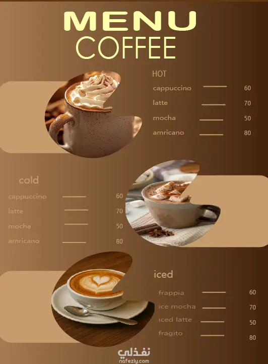 قمت بتصميم قائمة مشروبات (Menu) لكافيه بأسلوب Modern & Minimalist، يجمع بين الأناقة وسهولة القراءة. مميزات التصميم: هوية بصرية دافئة: استخدام درجات البني والبيج المتناغمة لتعكس أجواء القهوة الكلاسيكية. توزيع ذكي: تقسيم المنيو إلى 3 فئات (ساخن، بارد، مثلج) لضمان تجربة مستخدم سلسة. لمسات إبداعية: دمج الصور داخل أشكال هندسية انسيابية (Organic Shapes) تعطي طابعاً عصرياً غير تقليدي. وضوح البيانات: اختيار خطوط واضحة وتنسيق مرتب للأسعار لسهولة الاختيار. الأدوات المستخدمة: Adobe Photoshop / Illustrator. مستعدة لتنفيذ تصاميم مشابهة تناسب هوية مشروعك الخاص.