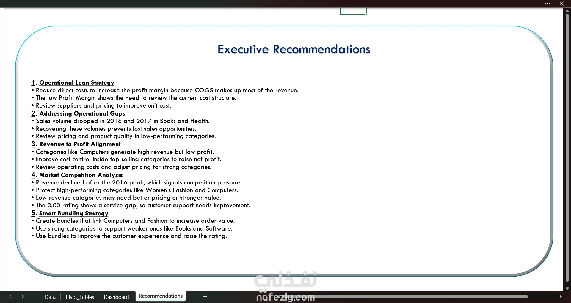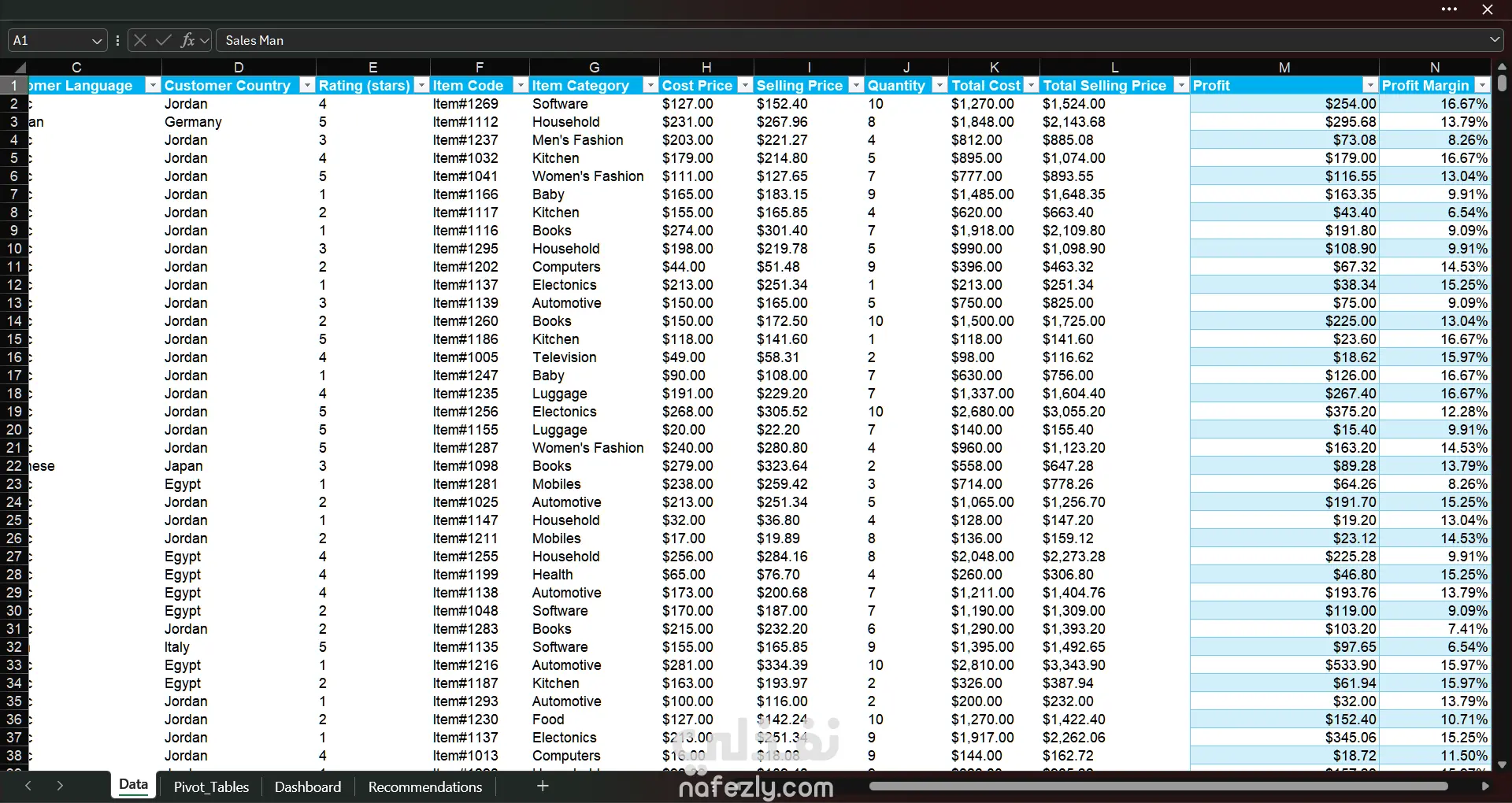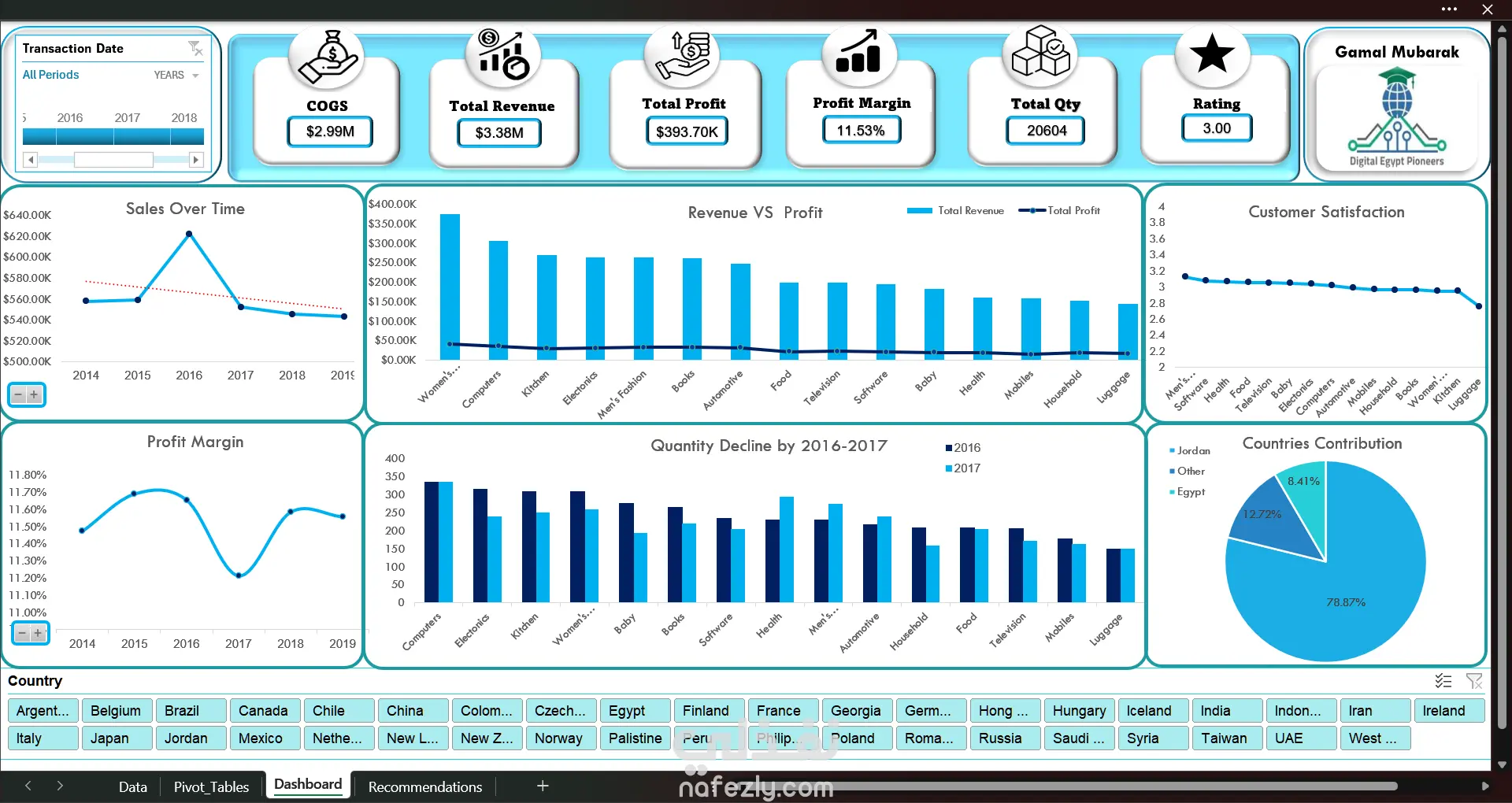 تحليل المنتجات والعملاء: مقارنة دقيقة بين الإيرادات والأرباح لمختلف فئات المنتجات (الإلكترونيات، الكتب، الملابس، وغيرها)، بالإضافة إلى تتبع مؤشر رضا العملاء (Customer Satisfaction).