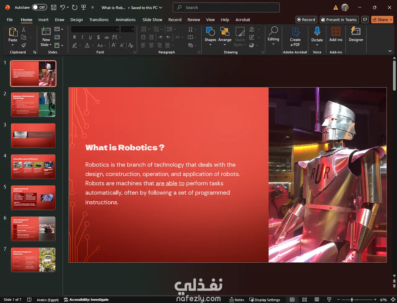 قمت في هذا المشروع بتصميم وإعداد عرض تقديمي (PowerPoint) احترافي يهدف إلى تبسيط وشرح أساسيات "علم الروبوتات" وتأثيره على مستقبل التكنولوجيا. تم التركيز في التصميم على التسلسل المنطقي للمعلومات المدعومة بالصور التوضيحية لتوصيل الفكرة بأفضل شكل ممكن للجمهور المستهدف. أبرز المحاور التي يغطيها العرض التقديمي: مقدمة تعريفية: توضيح مفهوم علم الروبوتات كفرع من التكنولوجيا يعنى بتصميم وبناء وتشغيل الروبوتات. مستقبل التكنولوجيا: تسليط الضوء على دور الروبوتات في مجالات الأتمتة ، تطورات الذكاء الاصطناعي ، وأهمية التعاون بين الإنسان والروبوت. تصنيف الروبوتات: تقسيم الروبوتات بناءً على وظيفتها إلى روبوتات صناعية ، روبوتات خدمية ، روبوتات متنقلة ، وروبوتات ذات أغراض خاصة. التطبيقات العملية: استعراض استخدامات الروبوتات في القطاعات الحيوية مثل الرعاية الصحية ، التصنيع ، والزراعة. تحليل المزايا والتحديات: مقارنة موضوعية بين إيجابيات استخدام الروبوتات كزيادة الكفاءة ، تحسين مستوى السلامة ، ورفع الإنتاجية ، مقابل التحديات مثل الاستغناء عن بعض الوظائف البشرية ، التكاليف الأولية المرتفعة ، والتحديات التقنية المعقدة.