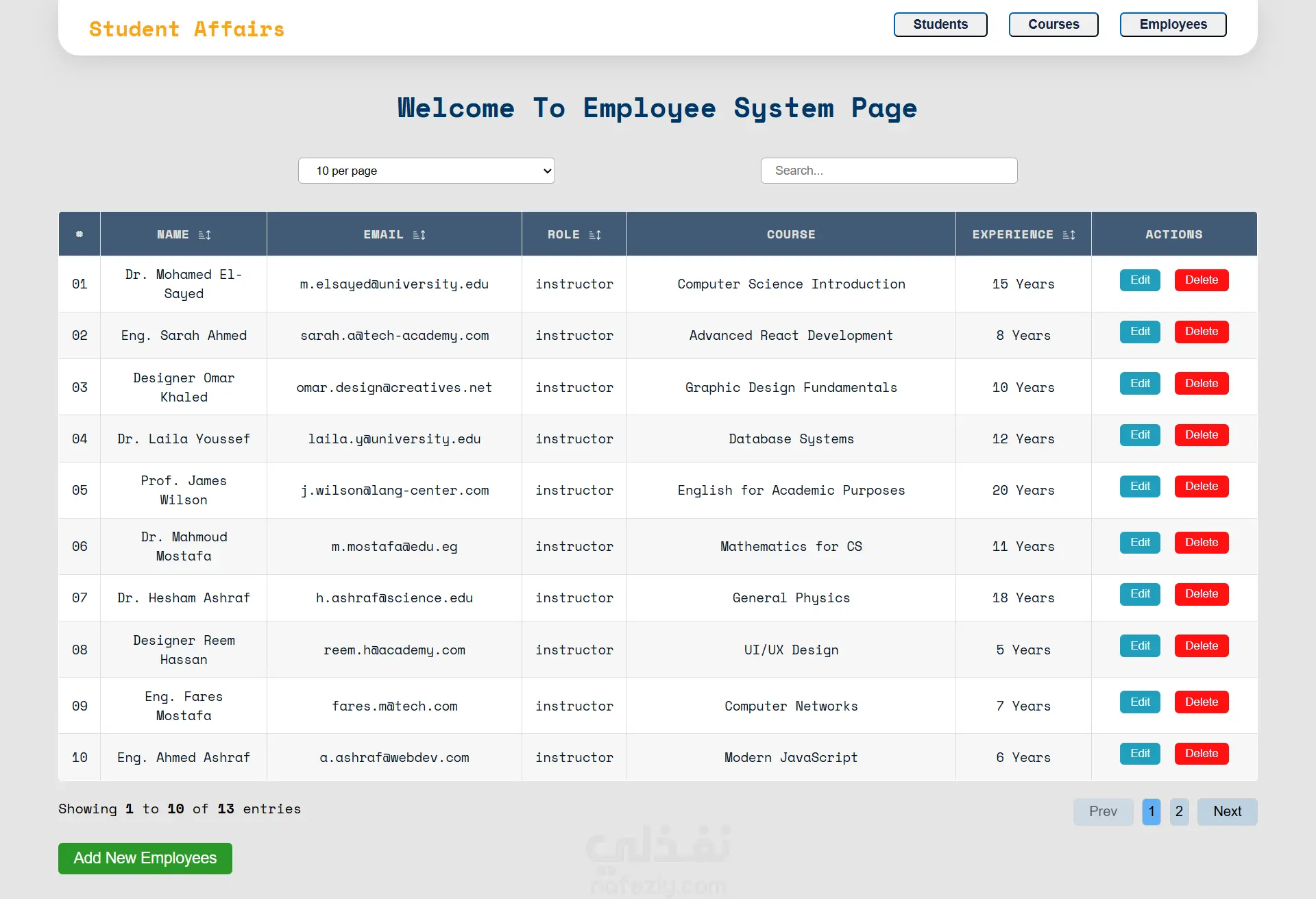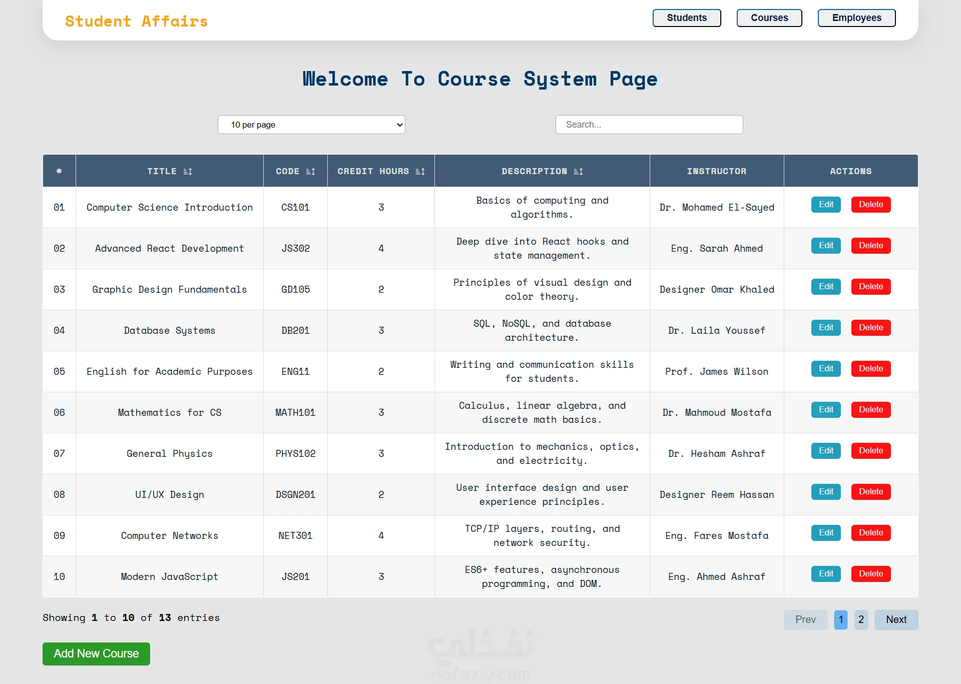 تطبيق ويب خفيف يهدف إلى تسهيل إدارة البيانات الأكاديمية للطلاب وأعضاء هيئة التدريس، باستخدام JavaScript الحديثة (ES6+) مع البرمجة كائنية التوجه (OOP) ووحدات ES Modules، ومحاكاة خادم API عبر json-server. مميزات المشروع: - عمليات CRUD كاملة للطلاب، المقررات، والموظفين. - جداول بيانات مع إمكانية الترتيب (Sorting)، البحث (Searching)، والتحكم في الصفحات (Client-side Pagination). - تصميم وحدات منفصلة لكل كيان مع إعادة استخدام المكونات (BaseForm، Modal). - هيكل كود نظيف يفصل بين البيانات (models) والتحكم (controllers) والعرض (view). - استخدام json-server لتوفير REST API وهمي للتطوير والاختبار. هدف المشروع: تسهيل إدارة شؤون الطلاب على موظفي المؤسسات التعليمية عبر تطبيق ويب منظم وسريع، مع إمكانية التوسع لاحقاً لاستخدام قاعدة بيانات حقيقية.