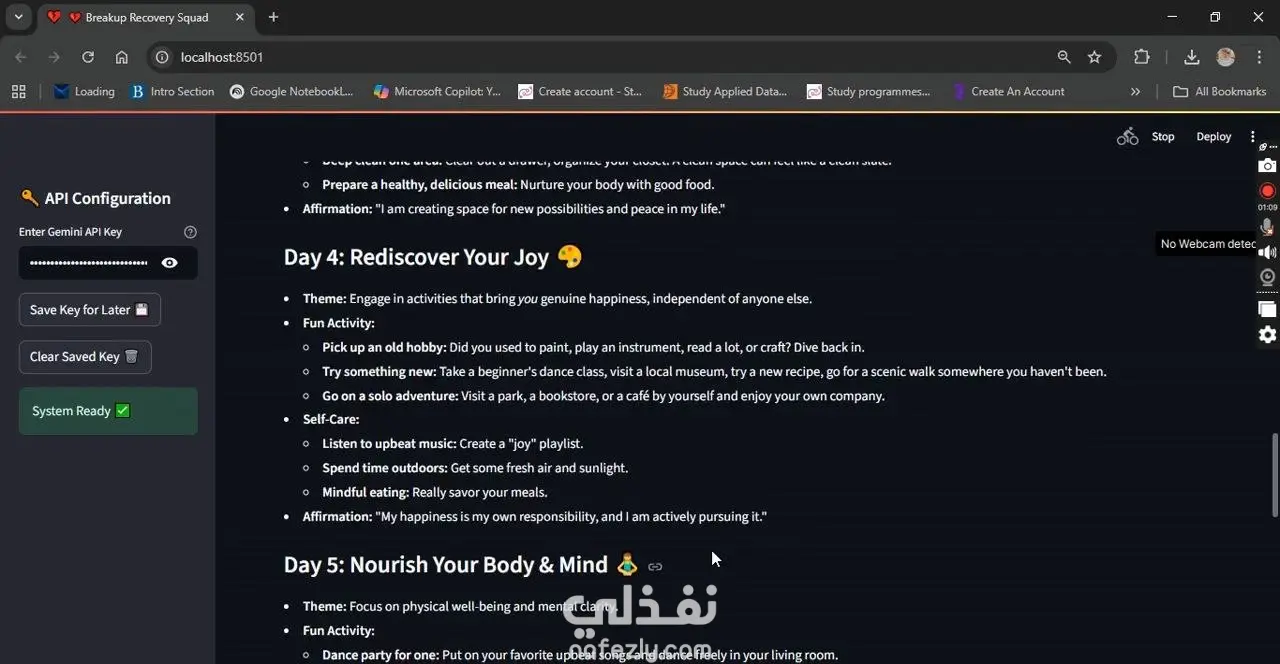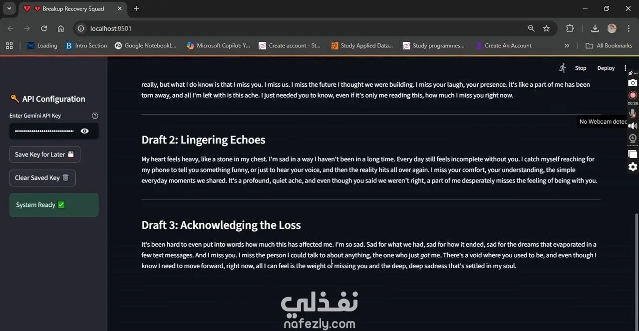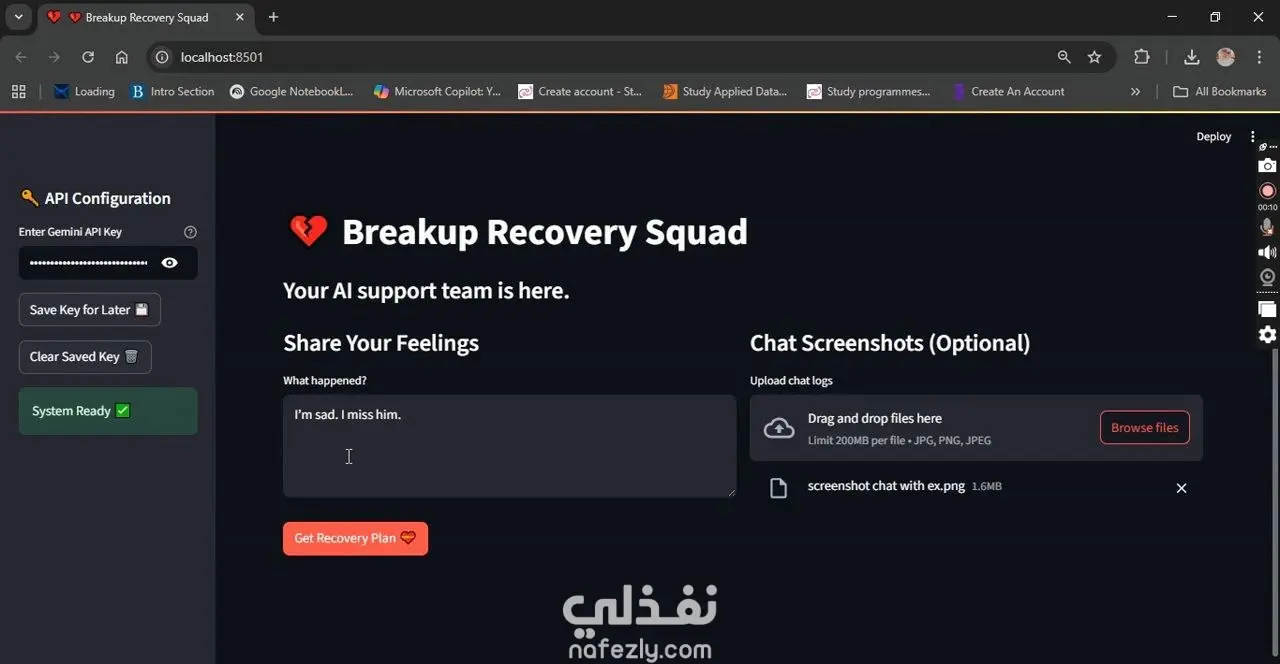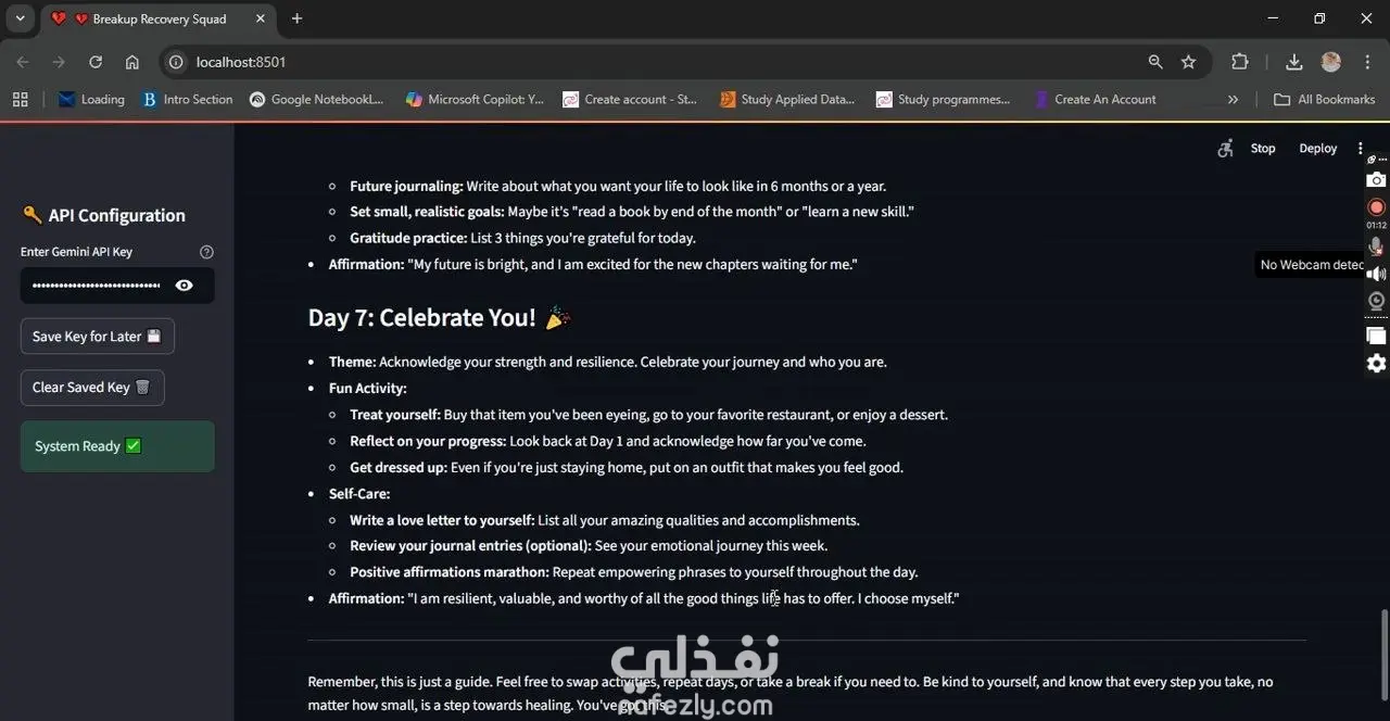 مشروع: AI Breakup Recovery Assistant هو نظام ذكي يعتمد على تقنيات الذكاء الاصطناعي ومعالجة اللغة الطبيعية (NLP)، يهدف إلى مساعدة المستخدمين على التعافي من آثار الانفصال العاطفي من خلال تقديم دعم نفسي مبدئي وتفاعل ذكي. يقوم النظام بتحليل مشاعر المستخدم من خلال النصوص (Sentiment Analysis)، ثم يقدم استجابات مخصصة ونصائح تساعده على تخطي المرحلة الصعبة بشكل تدريجي. كما يعتمد على نماذج تعلم آلي لفهم أنماط المشاعر والتفاعل بطريقة قريبة من الإنسان. يشمل المشروع مراحل متعددة بدءًا من جمع وتنظيف البيانات، مرورًا بتحليلها وبناء النموذج، وصولًا إلى تطوير واجهة تفاعلية تتيح للمستخدم تجربة سهلة وبسيطة. يهدف هذا المشروع إلى توظيف الذكاء الاصطناعي في تقديم حلول عملية تدعم الصحة النفسية، وتحسين تجربة المستخدم من خلال تفاعل ذكي وفعّال.