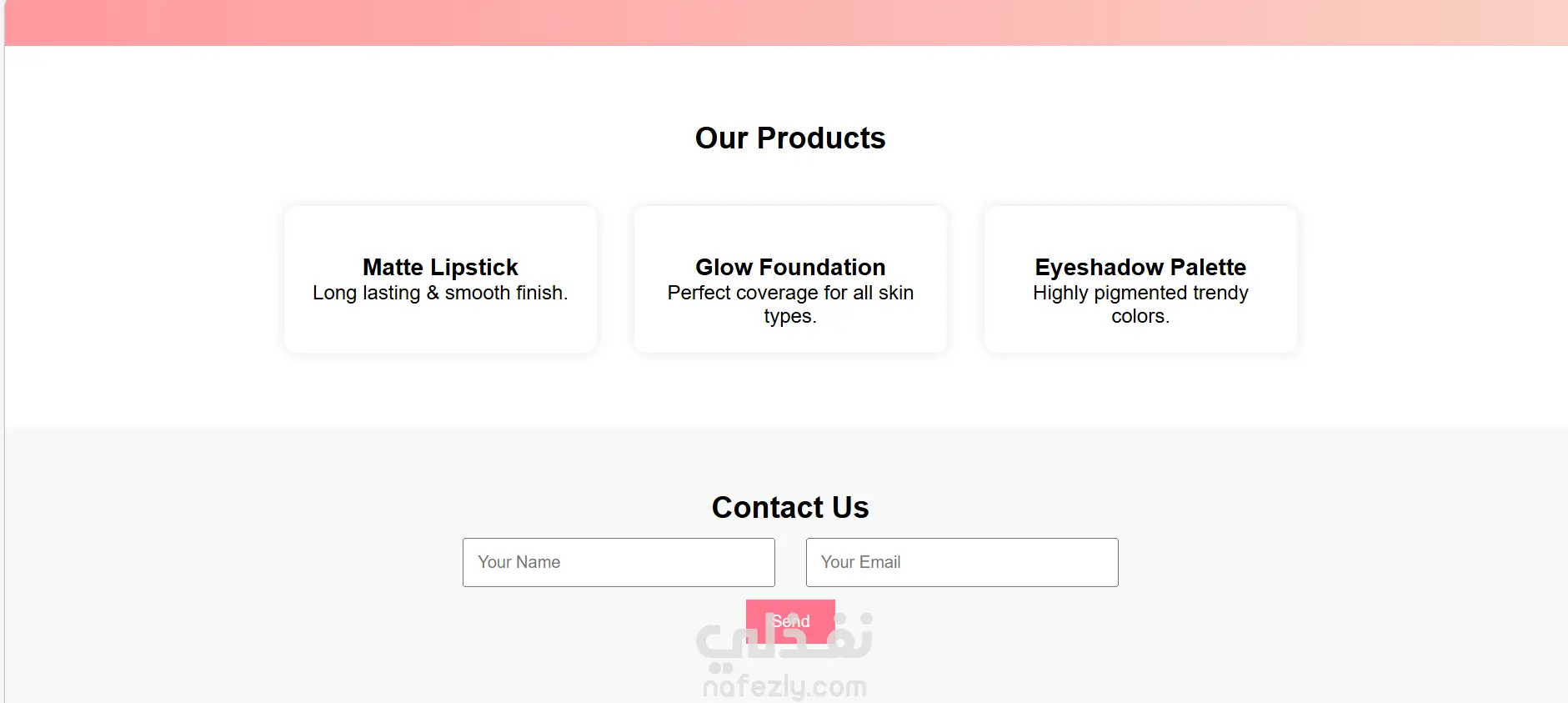 قمت بتصميم وتطوير موقع ويب لبراند ميكب يعرض المنتجات بطريقة عصرية وجذابة باستخدام HTML و CSS و JavaScript. يتميز الموقع بتصميم أنيق يعكس هوية العلامات التجميلية، مع تجربة مستخدم سهلة ومتجاوبة مع جميع الأجهزة (Responsive Design). يتضمن الموقع: صفحة رئيسية جذابة (Hero Section) عرض المنتجات في شكل بطاقات احترافية تأثيرات Hover Animation زر تنقل سلس بين الأقسام (Smooth Scroll) نموذج تواصل بسيط تم كتابة الكود بطريقة منظمة وقابلة للتطوير لإضافة متجر كامل مستقبلاً.