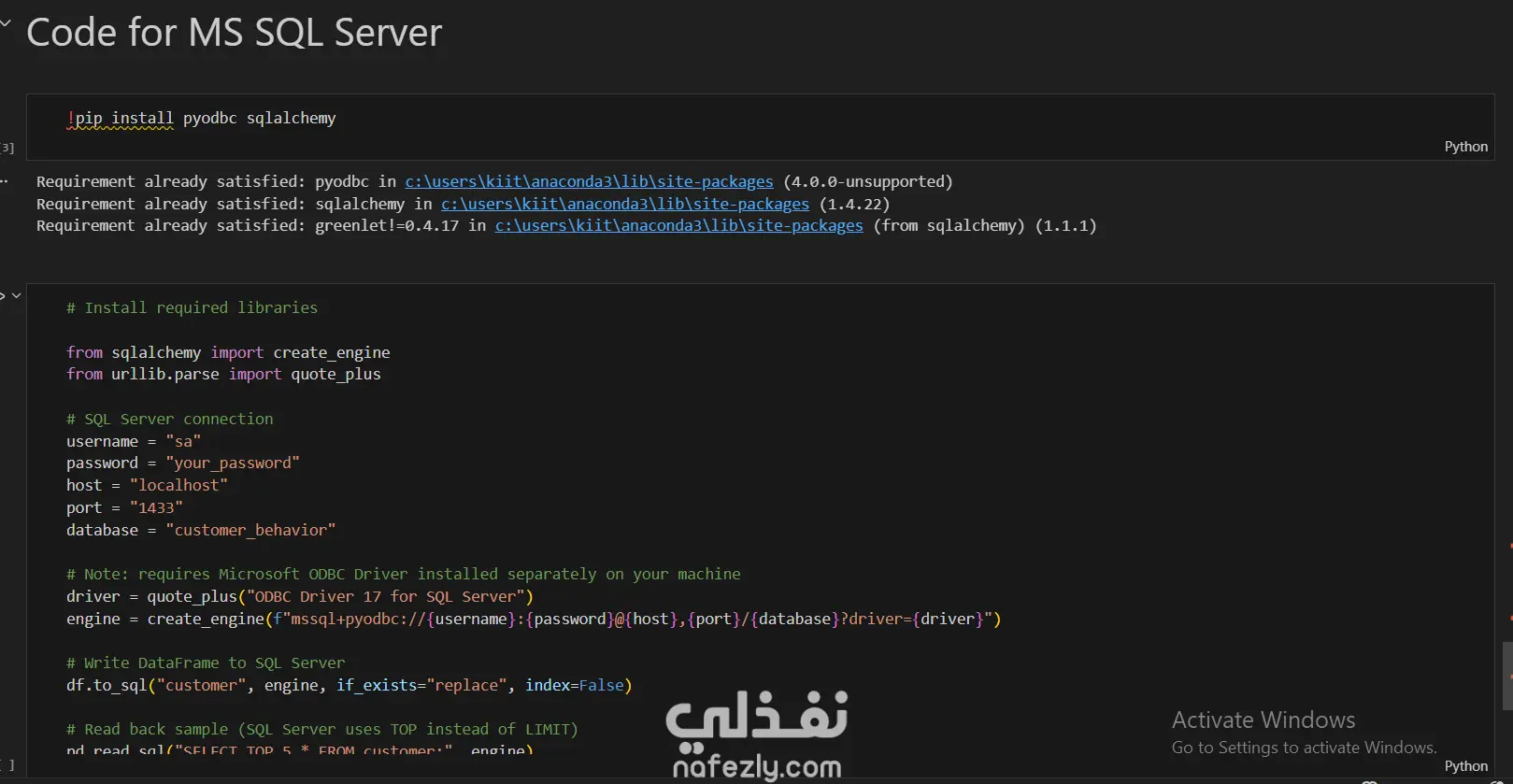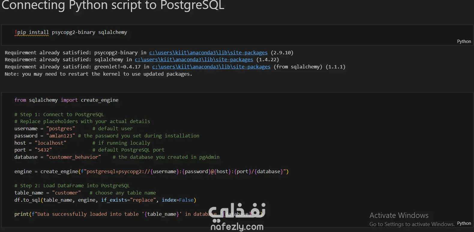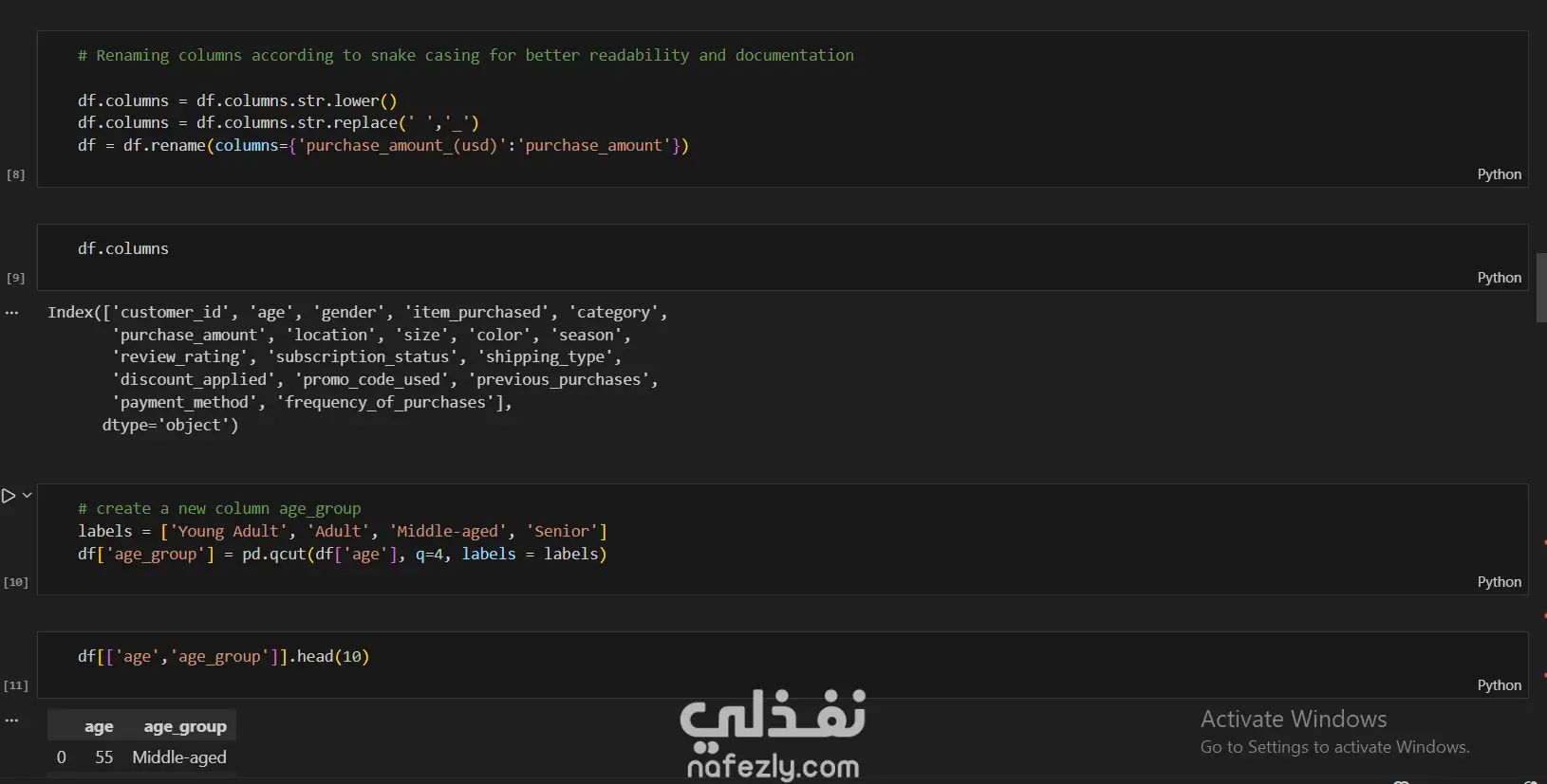 تم تنفيذ المشروع باستخدام Python في تنظيف البيانات ومعالجة القيم المفقودة، مع إنشاء متغيرات جديدة مثل الفئات العمرية ومعدل تكرار الشراء، ثم استخدام SQL لاستخراج أهم المؤشرات مثل الإيرادات حسب النوع، تأثير الخصومات، وأداء الفئات المختلفة.