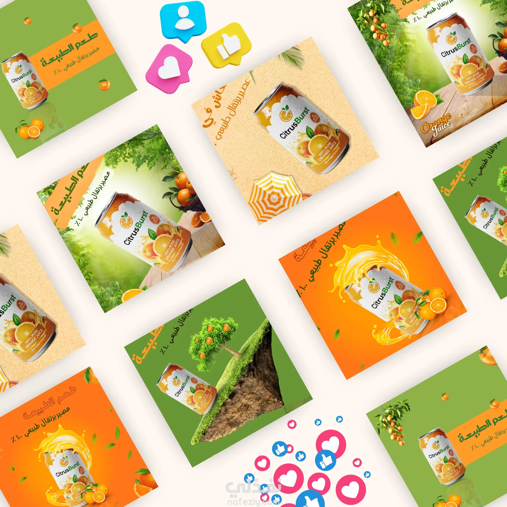 قمت بتصميم مجموعة من تصميمات السوشيال ميديا لمنتج ( عصير ) استخدمت ألوان مريحة للعين تتماشى مع إنتعاش المنتج و تتماشى مع الهوية البصرية لجذب الفئة المستهدفة تجاه المنتج.