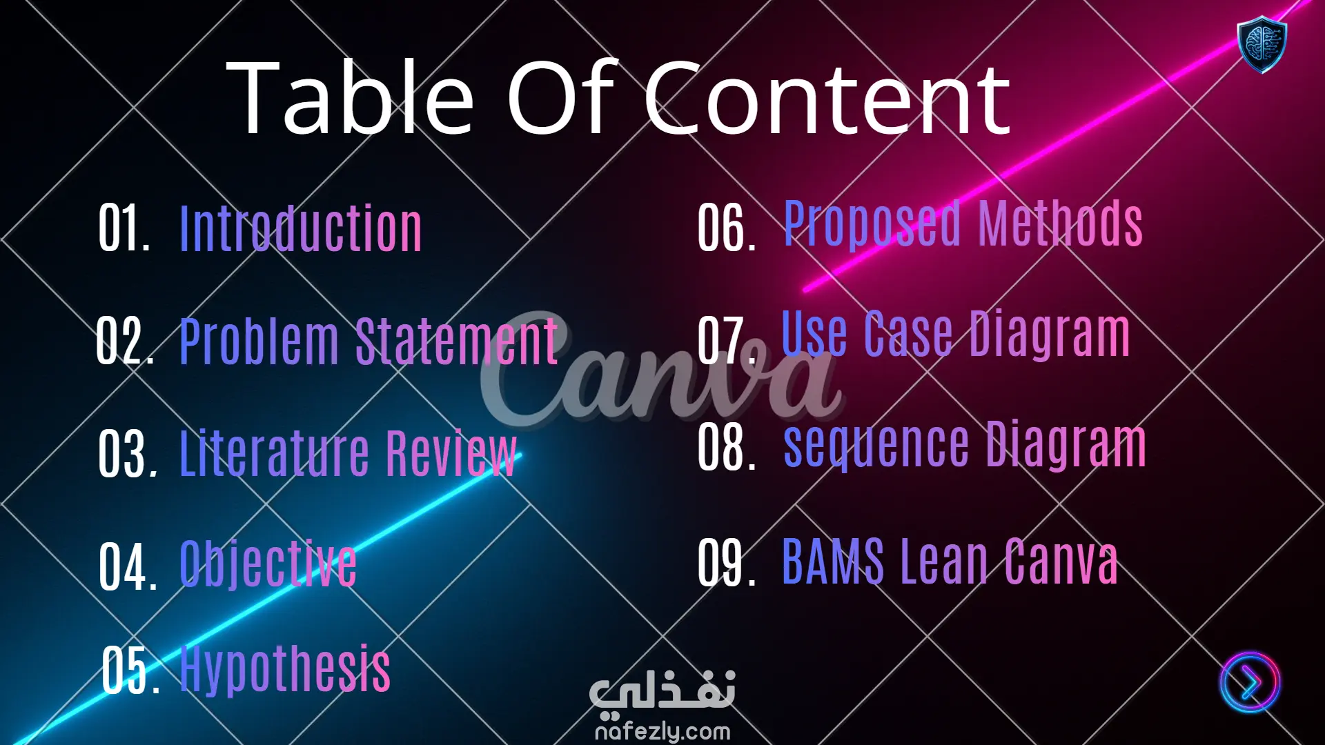يتميز بتصميم عصري وجذاب يناسب مختلف المجالات (تعليمي – تسويقي – مشاريع تخرج). تصميم سلايدات جذابة ومنظمة استخدام أيقونات وصور عالية الجودة تنسيق احترافي للنصوص والعناوين إبراز النقاط المهمة بشكل بصري مميز هذا النوع من العروض مناسب للطلاب، الشركات، وأصحاب المشاريع لعرض أفكارهم بشكل احترافي.