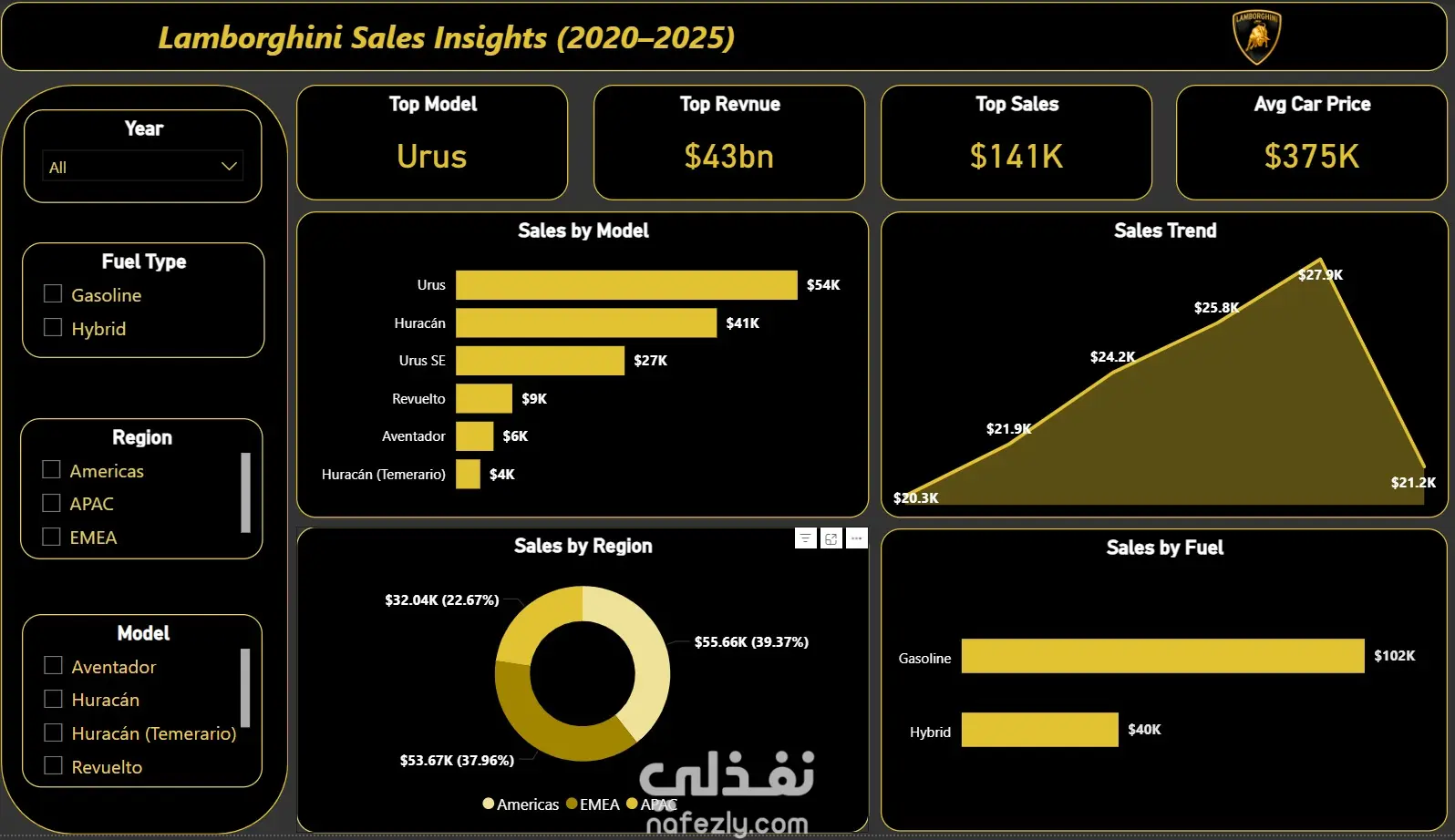قمت بتصميم لوحة تحكم تفاعلية احترافية لتحليل مبيعات شركة Lamborghini خلال الفترة من 2020 إلى 2025، بهدف تقديم رؤى واضحة تساعد في اتخاذ قرارات استراتيجية مبنية على البيانات. 🔹 محتوى اللوحة: تحليل شامل لأداء المبيعات عبر السنوات تحديد أفضل موديل مبيعًا (Top Model) عرض إجمالي الإيرادات ومتوسط أسعار السيارات تحليل المبيعات حسب الموديل (مثل Urus وHuracán) تحليل التوزيع الجغرافي (Americas – EMEA – APAC) مقارنة بين أنواع الوقود (Gasoline vs Hybrid) عرض اتجاهات المبيعات (Sales Trend) بشكل بصري واضح