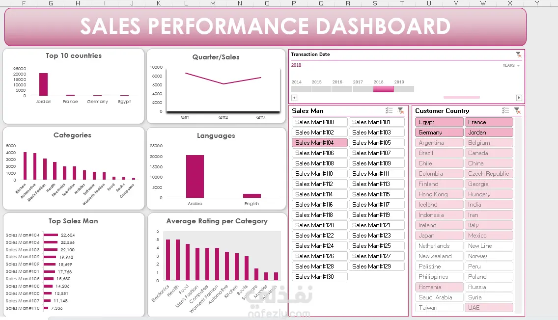 تم تصميم هذا المشروع ليقدم رؤية شاملة وتفصيلية لأداء المبيعات في الشركات التي تتعامل مع أسواق متعددة وفئات منتجات متنوعة. يتميز الداشبورد بتنسيق لوني موحد وجذاب يعزز من تجربة المستخدم (UX). ما يقدمه هذا الداشبورد للمنشأة: التحليل الجغرافي (Top 10 Countries): مراقبة أداء المبيعات في الدول العشر الأكثر تحقيقاً للأرباح (مثل الأردن، ألمانيا، مصر، وفرنسا). تحليل المبيعات الدورية (Quarterly Analysis): رسم بياني خطي يوضح تذبذب المبيعات خلال أرباع السنة، مما يساعد في التنبؤ بالنمو المستقبلي. أداء فريق المبيعات (Top Sales Man): قائمة تفاعلية لأفضل الموظفين أداءً مرتبة حسب حجم المبيعات الإجمالي لتشجيع التنافسية. تحليل الفئات (Product Categories): فرز دقيق للمبيعات حسب التصنيف (مثل الأجهزة، الأزياء، الأطعمة، والكتب) لمعرفة الفئات الأكثر طلباً. تقييم جودة الخدمة (Average Rating): ربط أداء المبيعات بتقييمات العملاء لكل فئة لضمان توازن الربحية مع رضا العميل. تفاعل لحظي (Advanced Slicers): نظام فلترة متقدم يتيح عرض البيانات حسب (اسم الموظف، الدولة، أو التاريخ) بمرونة فائقة. التحليل اللغوي (Languages): ميزة إضافية لتحليل مبيعات المحتوى أو المنتجات بناءً على لغة الجمهور المستهدف. الأدوات المستخدمة: Advanced Excel Functions Dynamic Slicers & Timelines Conditional Formatting Pivot Tables & Pivot Charts