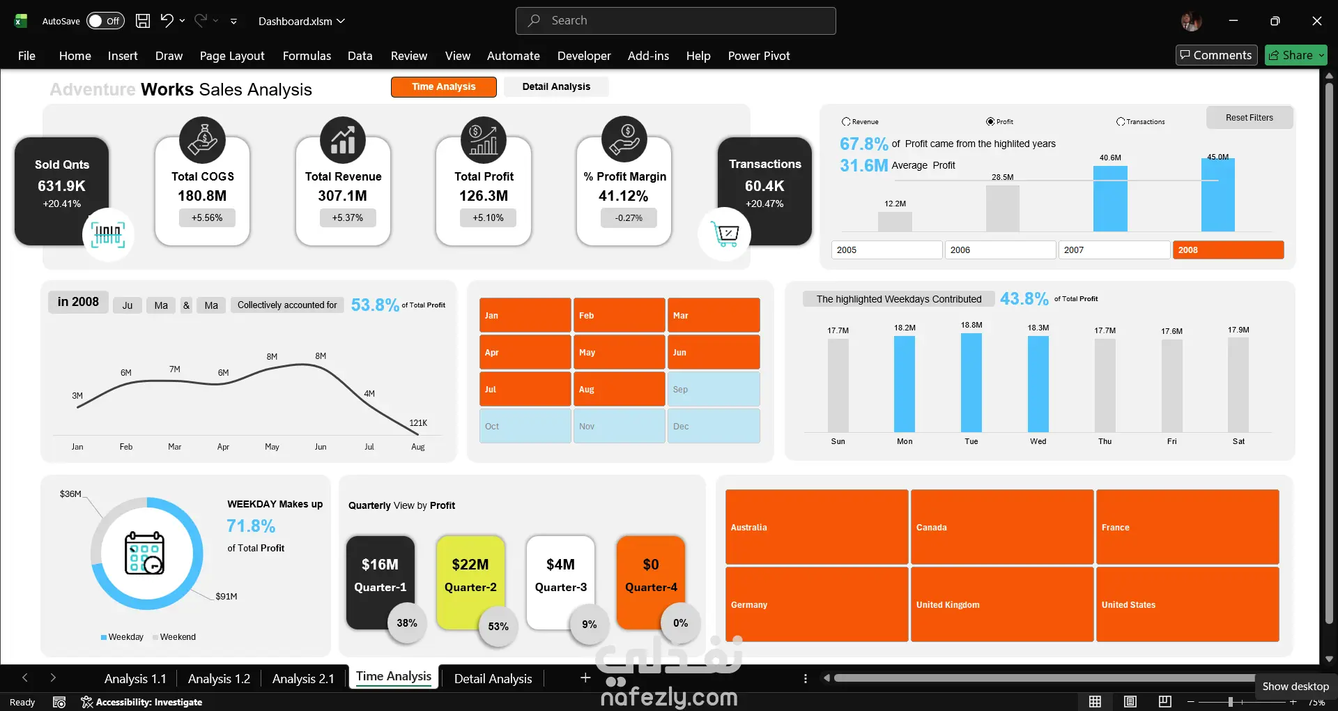 قمت بتطوير لوحة تحكم تحليل مبيعات تفاعلية بالكامل باستخدام Microsoft Excel لتحليل أكثر من 60 ألف معاملة بيع واستخراج رؤى تجارية مهمة تساعد أصحاب القرار. يعرض المشروع إمكانيات Excel كأداة Business Intelligence قوية من خلال استخدام Power Pivot و Pivot Tables وإنشاء واجهة تحليلية ديناميكية. ? أهم ما تم تنفيذه - تصميم Data Model باستخدام Power Pivot - إنشاء KPIs تفاعلية لمتابعة الأداء - تحليل Pareto (قاعدة 80/20) لتحديد المنتجات الأكثر ربحية - استخدام Slicers و Timeline Filters لعمل Dashboard ديناميكي - تحليل الإيرادات حسب العمر والدولة والتوقيت ? أهم النتائج - تحديد أن 5 منتجات فقط تحقق 31.5% من الأرباح - العملاء فوق 50 سنة يساهمون بـ 40% من الأرباح - 71% من الأرباح تتحقق خلال أيام العمل