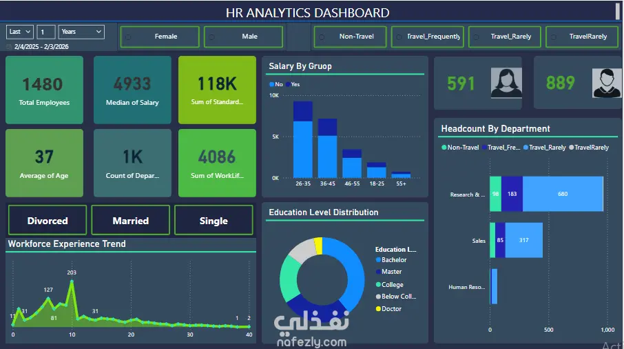 تحليل التركيبة السكانية: مراقبة أعداد الموظفين الإجمالية، متوسط الأعمار، والحالة الاجتماعية (Single, Married, Divorced).