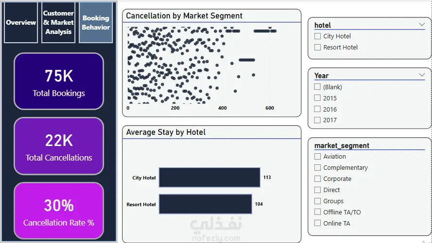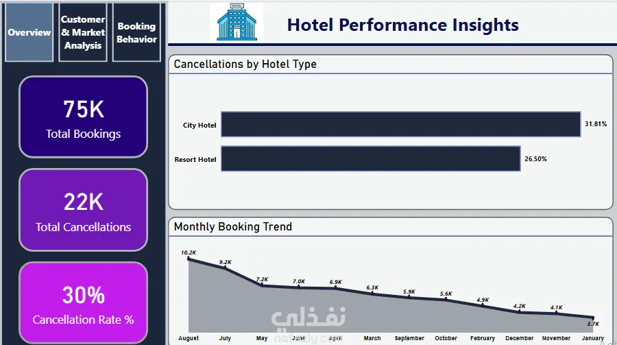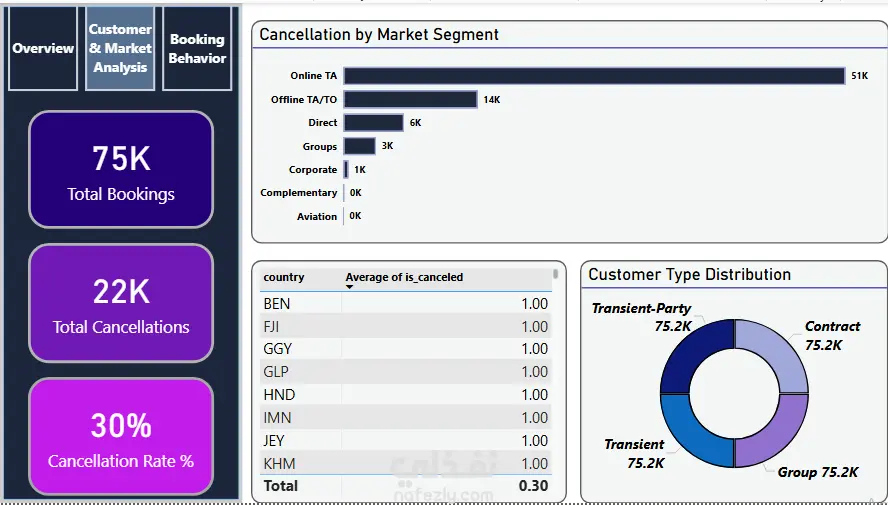 تحليل المؤشرات الرئيسية (KPIs): مراقبة إجمالي الحجوزات (75K)، وإجمالي الإلغاءات (22K)، ومعدل الإلغاء العام بنسبة 30%.