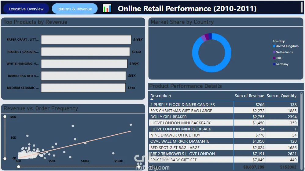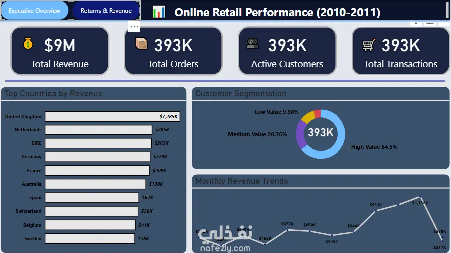 واجهة تفاعلية (UI/UX): نظام تنقل ذكي بين صفحات (Executive Overview) و (Returns & Revenue) لسهولة التصفح.