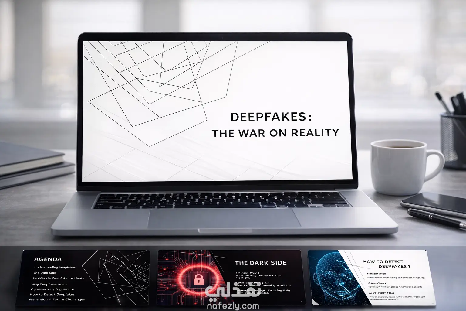 تصميم عرض تقديمي متكامل يتناول موضوع التزييف العميق (Deepfakes) من منظور تقني وأمني. ركزت في هذا المشروع على: بناء تسلسل منطقي للمعلومات (Agenda, Case Studies, Prevention). استخدام هوية بصرية "تقنية" (Dark Theme) تعكس جدية الموضوع. تنسيق البيانات المعقدة في نقاط واضحة سهلة القراءة. دمج العناصر البصرية والأيقونات لتعزيز الرسالة وتجنب الحشو البصري.