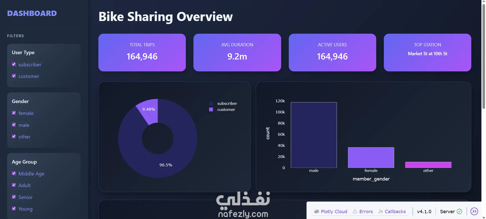داشبورد تحليل بيانات Bike Sharing المشروع ده عبارة عن داشبورد تفاعلي معمول باستخدام Dash، هدفه تحليل بيانات استخدام العجل بشكل سهل وبشكل بصري. المستخدم يقدر يفلتر البيانات ويشوف الإحصائيات والرسومات بتتغير قدامه مباشرة. 🚀 أهم المميزات فلاتر تفاعلية تقدر تتحكم في البيانات حسب: نوع المستخدم النوع (ذكر / أنثى) الفئة العمرية وأي اختيار بيأثر فورًا على كل الرسومات والإحصائيات. مؤشرات مهمة (KPIs) الداشبورد بيعرض: إجمالي الرحلات متوسط مدة الرحلة عدد المستخدمين أكتر محطة بداية استخدامًا الرسومات البيانية باستخدام Plotly Express: Pie Chart → توزيع المستخدمين Bar Chart → توزيع حسب النوع Line (Wave) Chart → مدة الرحلات بشكل متدرج Scatter → أشهر محطات البداية Funnel → أشهر محطات النهاية التصميم شكل مودرن ودارك معمول بـ dash-bootstrap-components تقسيمة واضحة (سايد بار + محتوى) التقنيات المستخدمة Python pandas Dash Plotly Express استخداماته تحليل بيانات داشبورد بيزنس مشاريع بورتفوليو دراسات أكاديمية