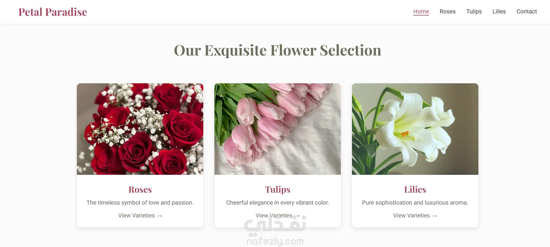 تصميم وبرمجة واجهة مستخدم (Landing Page) لمتجر إلكتروني لبيع الزهور تحت مسمى 'Petal Paradise'. يركز المشروع على تقديم تجربة بصرية أنيقة وبسيطة (Minimalist) تعكس جمال الطبيعة، مع عرض احترافي للفئات الأساسية (الورد، التوليب، الزنابق). تم مراعاة تناسق الألوان الترابية والهادئة مع سهولة التصفح لضمان جذب العملاء وتحفيزهم على تصفح المجموعات.