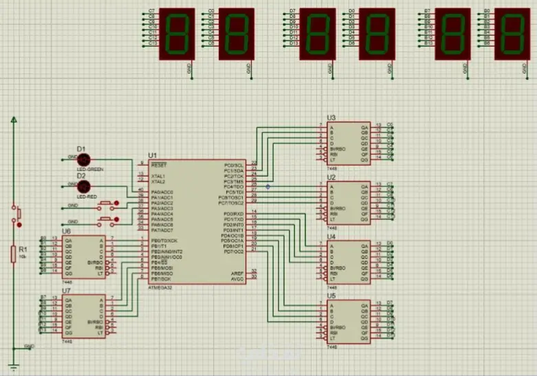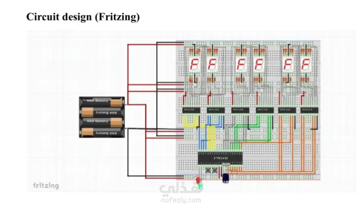 يعرض هذا المشروع تصميم وتنفيذ نظام ساعة رقمية يعتمد على المتحكم الدقيق ATmega32. تقوم الساعة بعرض الساعات والدقائق والثواني باستخدام ست شاشات 7-Segment مرتبة بنظام 12 ساعة. يعتمد النظام على مذبذب كريستالي (Crystal Oscillator) لضمان دقة التوقيت، حيث يتم برمجة المتحكم لعدّ الوقت بدقة مع تحديث الشاشات بشكل لحظي (Real-Time). يوضح هذا المشروع مفاهيم مهمة في الأنظمة المدمجة مثل: توصيل المتحكمات الدقيقة مع المكونات الإلكترونية. استخدام تقنية Multiplexing للتحكم في شاشات 7-Segment. تطبيق مبادئ تصميم الأنظمة المدمجة (Embedded Systems Design). Component list ➢ Hardware Components: • ATmega32 Microcontroller • Six Common-Cathode 7-Segment Displays • 20 MHz Crystal Oscillator • Two 22 pF Capacitors (for the crystal) • Current-limiting resistors (220Ω) for each segment • 6 × BCD • Leds • Resistors • Push buttons (Reset, Set Time) • Breadboard • Jumper wires • 5V Power Supply ➢ Software Tools: • Atmel Studio for AVR • Proteus for simulation • Fritzing for circuit drawing