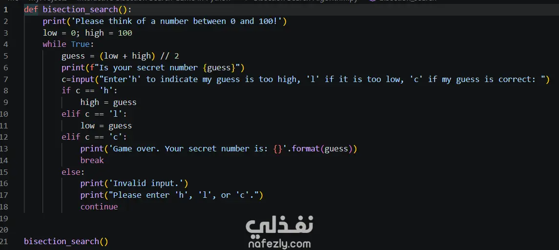 1. توضيح نوع العمل: هذا المشروع عبارة عن تطبيق برمجي تفاعلي يعمل عبر واجهة سطر الأوامر (CLI)، يهدف إلى تطبيق واحدة من أهم وأسرع خوارزميات البحث في علوم الحاسوب وهي "خوارزمية البحث الثنائي". يقوم البرنامج بتجسيد الخوارزمية في شكل "لعبة تخمين ذكية"، حيث يفكر المستخدم في رقم (من 0 إلى 100)، ويقوم الحاسوب باستنتاج هذا الرقم في أقل عدد ممكن من المحاولات من خلال تضييق نطاق البحث إلى النصف في كل خطوة بناءً على توجيهات المستخدم. 2. ميزات المشروع: - الكفاءة العالية (Efficiency): يبرز المشروع قوة البحث الثنائي وسرعته في الوصول للنتيجة مقارنة بالبحث الخطي، مما يعكس فهماً عميقاً لهياكل البيانات والخوارزميات الأساسية. - التفاعل الديناميكي: واجهة تفاعلية تعتمد على مدخلات المستخدم لتوجيه مسار تنفيذ البرنامج خطوة بخطوة. - معالجة الأخطاء (Error Handling): يتميز الكود بالمرونة؛ حيث يتضمن نظاماً للتعامل مع المدخلات الخاطئة (Invalid input). إذا قام المستخدم بإدخال حرف غير متوقع، يقوم البرنامج بتنبيهه وتوجيهه لإدخال الخيارات الصحيحة دون أن يتعطل أو يتوقف فجأة. - البساطة والتنظيم: الكود مكتوب بأسلوب بسيط ومقروء يسهل فهمه، مع استخدام مثالي ومباشر للحلقات التكرارية (while) والجمل الشرطية المتقدمة (if/elif/else). 3. طريقة التنفيذ: - تم بناء هذا المشروع بالاعتماد على المنطق الرياضي والبرمجي البحت باستخدام لغة بايثون، ويسير التنفيذ وفق الخطوات البرمجية التالية: -- تحديد نطاق البحث: تبدأ الخوارزمية بتعريف الحد الأدنى (low = 0) والحد الأقصى (high = 100). -- حساب نقطة المنتصف: داخل حلقة تكرارية مستمرة (while True)، يحسب البرنامج نقطة المنتصف كنقمة تخمين أولية عبر القسمة الصحيحة (low + high) // 2. -- تحديث النطاق بناءً على الشرط: ==> إذا أشار المستخدم أن التخمين أعلى من رقمه السري (بإدخال h)، يتم جعل الحد الأقصى مساوياً لقيمة التخمين لتقليص النطاق للنصف السفلي. ==> إذا كان التخمين أقل (بإدخال l)، يتم تعديل الحد الأدنى ليصبح مساوياً لقيمة التخمين لتقليص النطاق للنصف العلوي. -- الوصول للهدف: بمجرد تأكيد المستخدم أن التخمين صحيح (بإدخال c)، يعرض البرنامج النتيجة النهائية وينهي الحلقة البرمجية باستخدام أمر break.