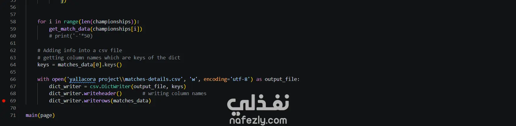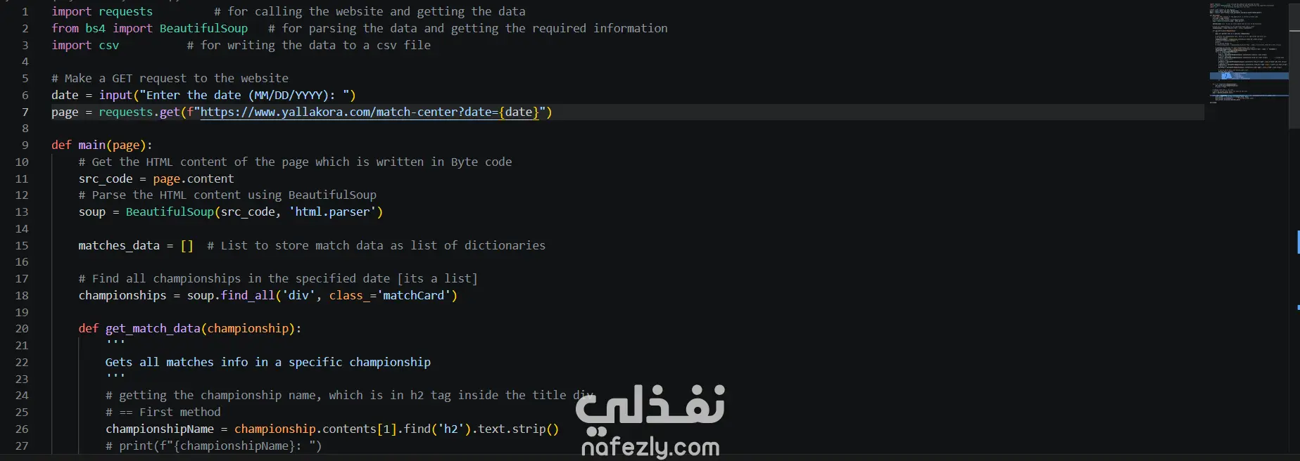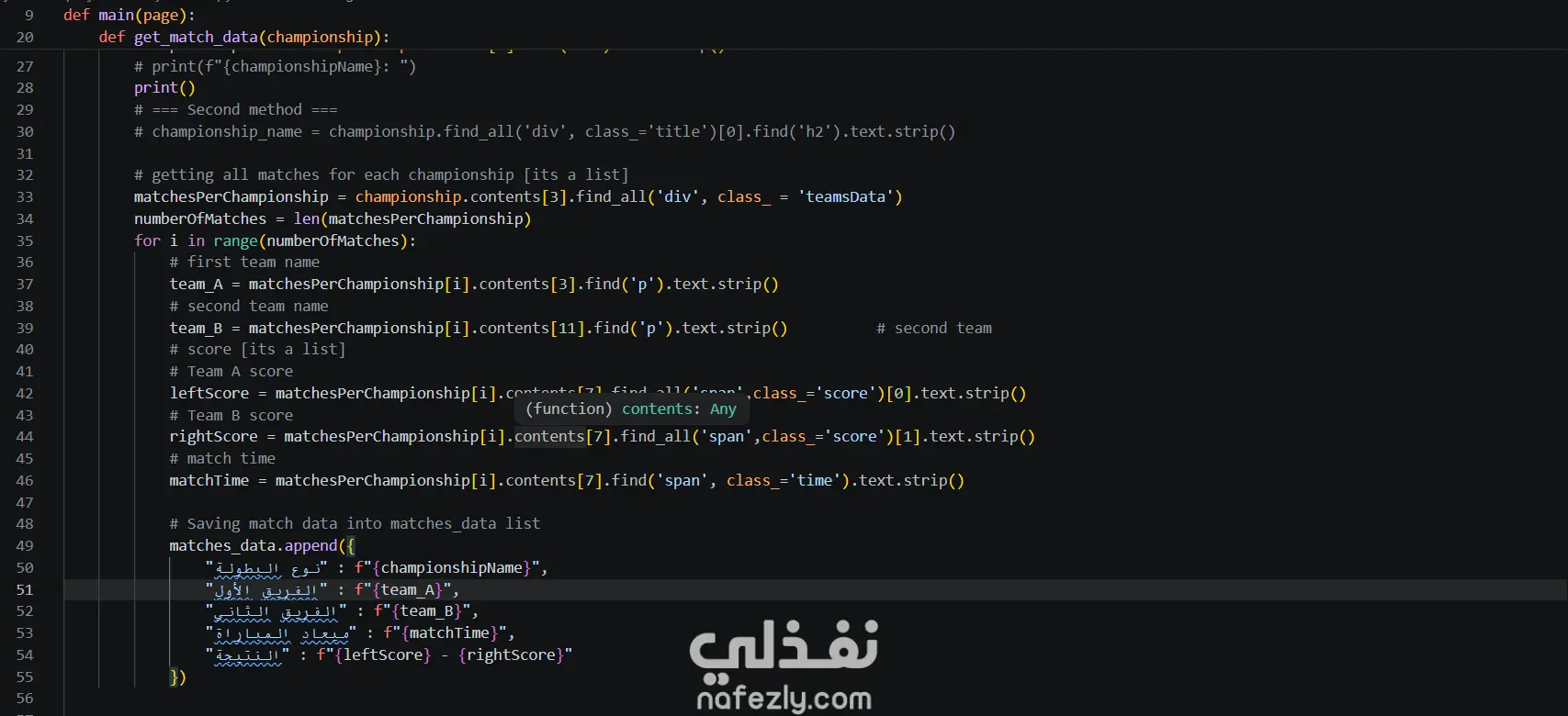 - معالجة البيانات: استخراج أسماء الأندية والنتائج من داخل الـ teamsData باستخدام الـ contents والـ find_all بدقة عالية.