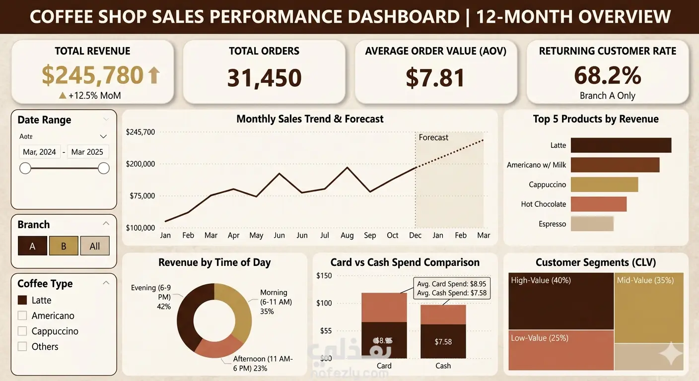 تحليل بيانات مبيعات سلسلة كافيهات (أكثر من 300 ألف سجل) قمت بتحليل شامل لأكثر من 300,000 سجل مبيعات لسلسلة مقاهي متعددة الفروع بهدف دعم اتخاذ القرار. شمل المشروع: معالجة البيانات: تنظيف ودمج مجموعات البيانات الضخمة باستخدام لغة Python ومكتبة Pandas لتصحيح أخطاء التسمية ومعالجة البيانات المفقودة. لوحات القيادة التفاعلية: بناء داشبورد احترافي باستخدام Power BI لتتبع مؤشرات الأداء الرئيسية (KPIs) مثل الإيرادات، متوسط قيمة الطلب (AOV)، والنمو السنوي. رؤى استراتيجية: تحديد ساعات الذروة (6-9 مساءً) والمنتجات الأكثر ربحية، مما ساعد في تحسين جدولة الموظفين وإدارة المخزون. تحليل سلوك العملاء: تقسيم العملاء بناءً على القيمة الدائمة (CLV) واكتشاف أن مستخدمي البطاقات البنكية ينفقون بنسبة 18% أكثر من مستخدمي الدفع النقدي. الأدوات المستخدمة: Power BI (DAX), Python, SQL, Excel.