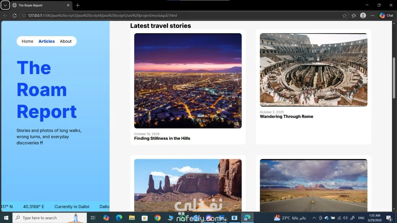 هذا المشروع عبارة عن واجهة موقع سياحي/مدونة سفر احترافية (Landing Page + Multi Sections) تم تصميمها وتطويرها باستخدام HTML, CSS, JavaScript.