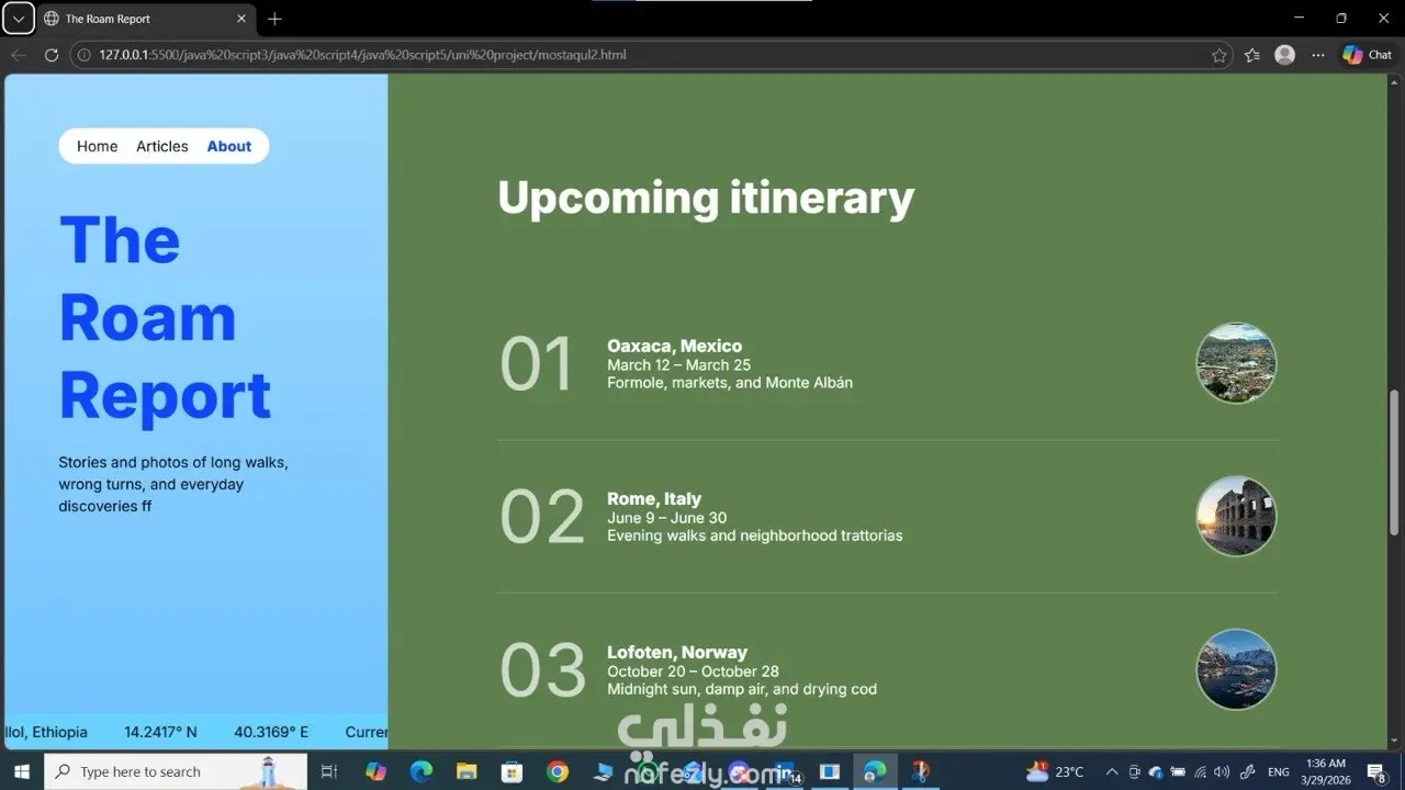 الموقع يقدم تجربة بصرية جذابة لمحتوى السفر والترحال، ويحتوي على: