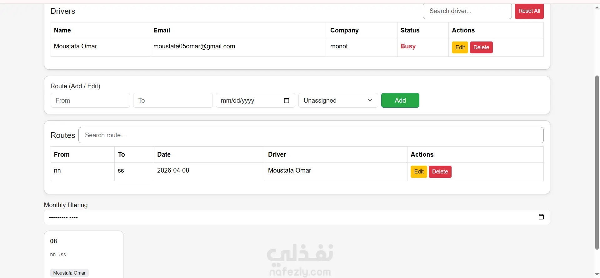 نظام جدولة السائقين (Driver Scheduling System) – العمل ذو الصلة تم تطوير نظام ويب متكامل لإدارة السائقين وجدولة الرحلات بهدف تحسين تنظيم عمليات النقل وتوزيع السائقين على الرحلات بكفاءة عالية. تفاصيل النظام: إدارة السائقين (Drivers): إمكانية إضافة وتعديل بيانات السائقين، بما في ذلك الاسم، البريد الإلكتروني، والشركة. عرض قائمة السائقين في جدول منظم يحتوي على الحقول الأساسية وحالة النشاط (Status). إمكانية البحث عن أي سائق بسهولة ضمن القائمة. إدارة الرحلات (Routes): إمكانية إضافة وتعديل الرحلات مع تحديد نقطة البداية (From)، نقطة الوصول (To)، تاريخ الرحلة (Date)، والسائق المعين (Driver) أو ترك الرحلة غير معينة (Unassigned). عرض جميع الرحلات في جدول مرتب مع إمكانية البحث والفرز حسب الحقول المختلفة. فلترة شهرية (Monthly Filtering): عرض الرحلات بناءً على الشهر لتسهيل متابعة الرحلات الشهرية. في حالة عدم وجود رحلات للشهر المحدد، يظهر تنبيه واضح: “No routes this month”. واجهة المستخدم (UI/UX): تصميم واجهة سهلة الاستخدام تتيح التنقل بين أقسام السائقين والرحلات بشكل سلس ومنظم. تضمن تجربة استخدام سلسة مع عرض البيانات بطريقة واضحة ومبسطة. المتطلبات التقنية: تم بناء النظام باستخدام HTML، CSS، وJavaScript مع كود منظم يسهل تطويره مستقبليًا. النظام قابل للتوسع وإمكانية ربطه لاحقًا بقاعدة بيانات أو باك إند حسب الحاجة. النتيجة: تم تسليم نظام في يومين كامل يعمل بكفاءة لإدارة السائقين والرحلات، مع تحسين وضوح المعلومات، وتسهيل متابعة الرحلات الشهرية، وتبسيط عملية توزيع السائقين على الرحلات، مما ساهم في رفع كفاءة العمل وتحسين التنظيم الإداري.